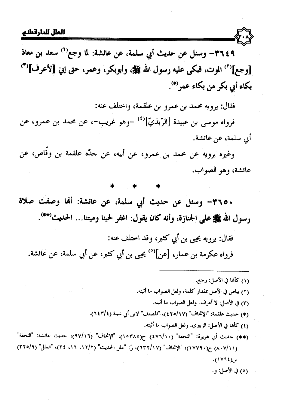 3650- وسئل عن حديث أبي سلمة، عن عائشة، أنها وصفت صَلَاةَ رَسُولِ اللَّهِ صَلَّى اللَّهُ عَلَيْهِ وَسَلَّمَ على الجنازة، وأنه كان يقول: اغفر لحينا وميتنا الْحَدِيثَ.