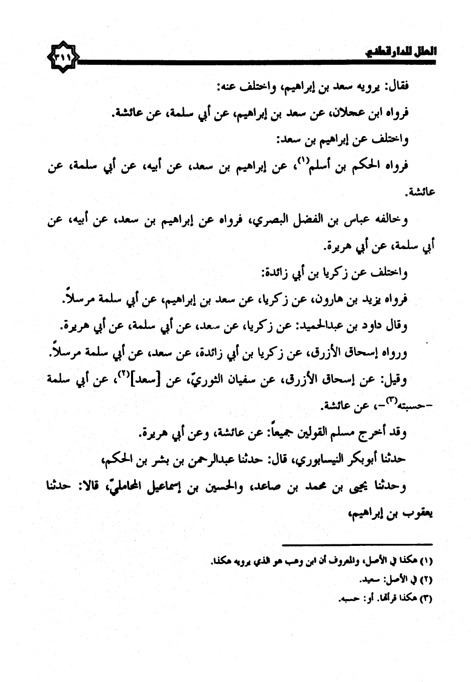 فرواه يزيد بن هارون، عن زكريا عَنْ سَعْدِ بْنِ إِبْرَاهِيمَ، عَنْ أَبِي سَلَمَةَ، مرسلا وقال داود بن عبد الحميد: عَنْ زَكَرِيَّا، عَنْ سَعْدٍ، عَنْ أَبِي سَلَمَةَ، عَنْ أَبِي هريرة.