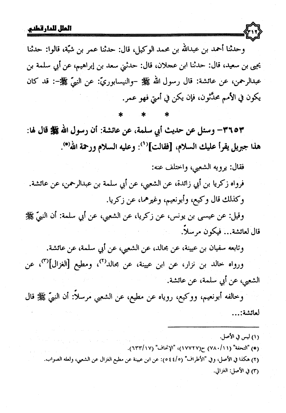 3653- وسئل عن حديث أبي سلمة، عن عائشة، أن رسول الله صلى الله عليه وسلم، قال لها: هذا جبريل يقرأ عليك السلام، فقالت: وعليه السلام ورحمة الله.