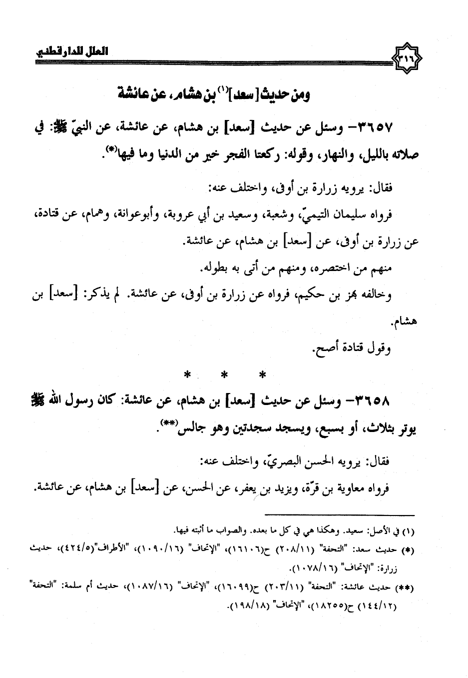 3657- وَسُئِلَ عَنْ حَدِيثِ سَعْدِ بْنِ هِشَامٍ، عَنْ عَائِشَةَ، عَنِ النَّبِيِّ صَلَّى اللَّهُ عَلَيْهِ وَسَلَّمَ في صلاته بالليل والنهار، وقوله: ركعتا الفجر خَيْرٌ مِنَ الدُّنْيَا وَمَا فِيهَا.