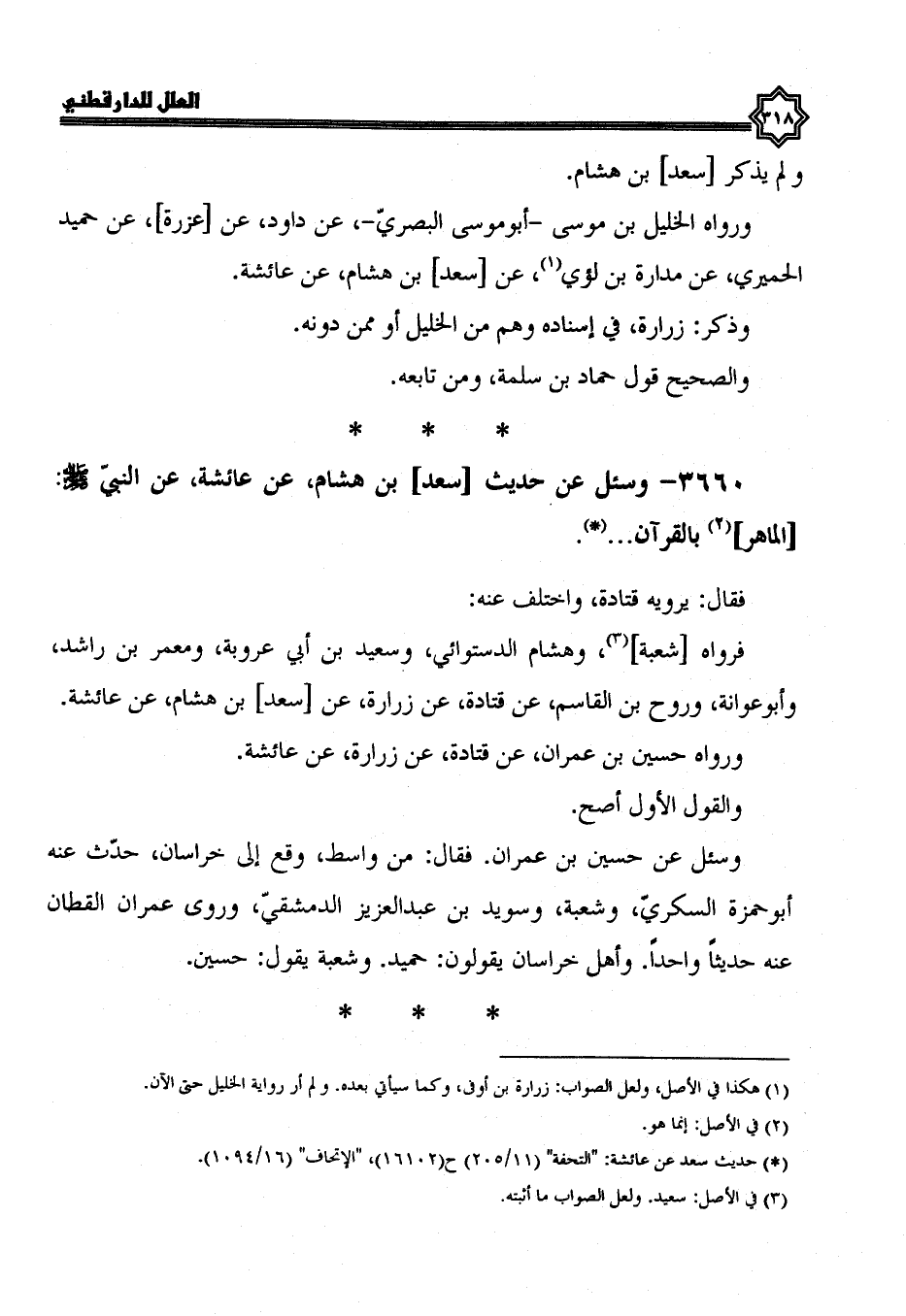 3660- وَسُئِلَ عَنْ حَدِيثِ سَعْدِ بْنِ هِشَامٍ، عَنْ عَائِشَةَ: عَنِ النَّبِيِّ صَلَّى اللَّهُ عَلَيْهِ وَسَلَّمَ الماهر بالقرآن ...