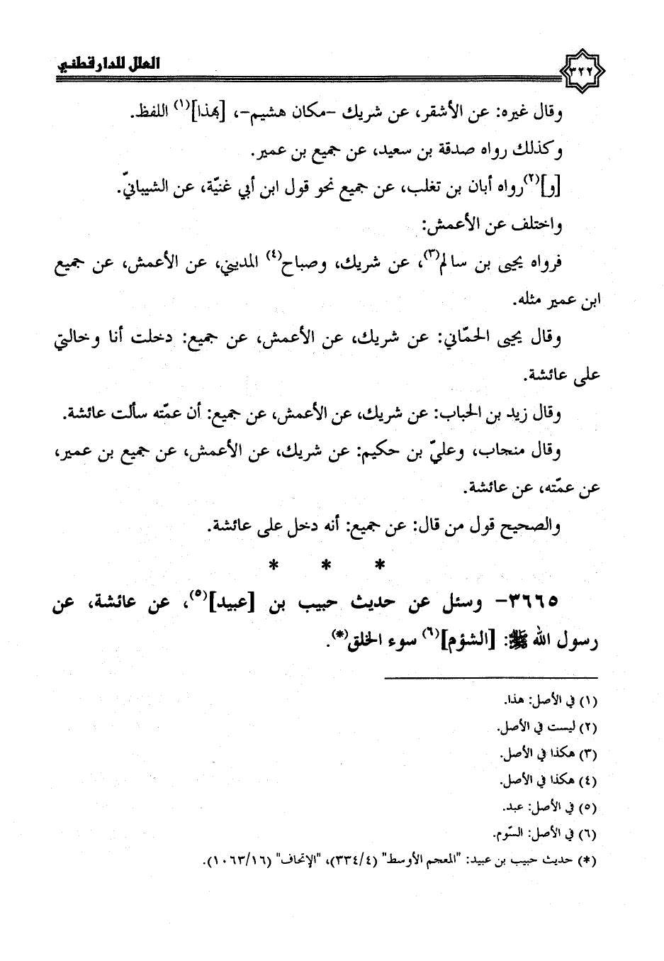 وقال منجاب، وعلي بن حكيم: عن شريك، عن الأعمش، عن جميع بن عمير، عن عمته، عن عائشة.