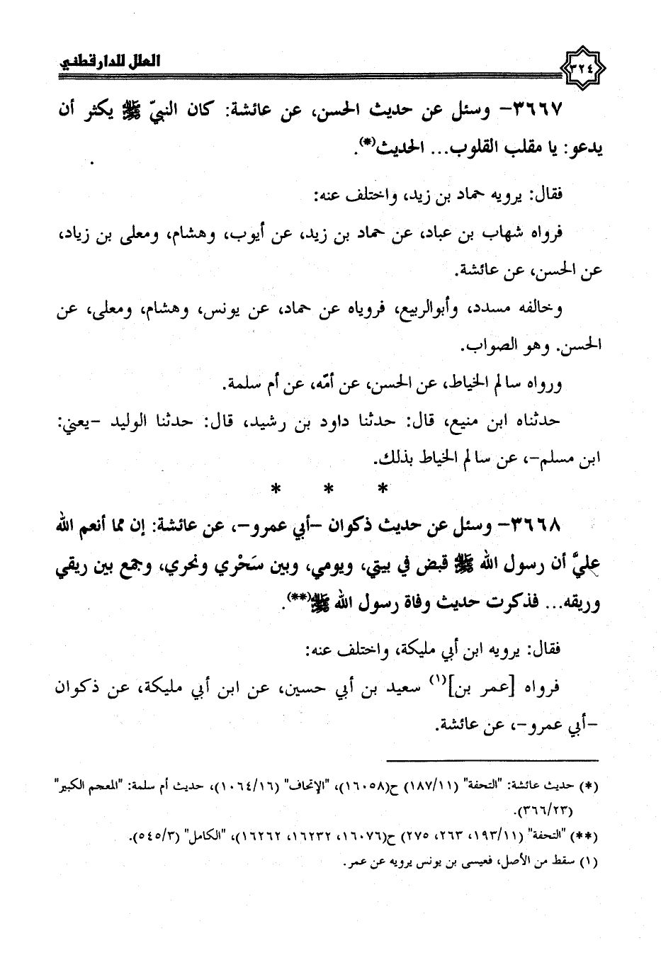 3667- وسئل عن حديث الحسن، عن عائشة، كان النبي صلى الله عليه وسلم يكثر أن يدعو: يا مقلب القلوب الْحَدِيثَ.