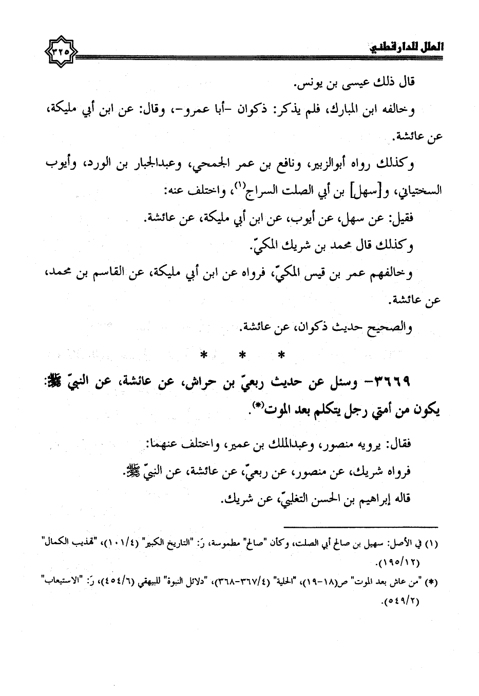 3669- وَسُئِلَ عَنْ حَدِيثِ رِبْعِيِّ بْنِ حِرَاشٍ، عَنْ عَائِشَةَ، عَنِ النَّبِيِّ صَلَّى اللَّهُ عَلَيْهِ وَسَلَّمَ: يكون من أمتي رجل يتكلم بعد الموت.