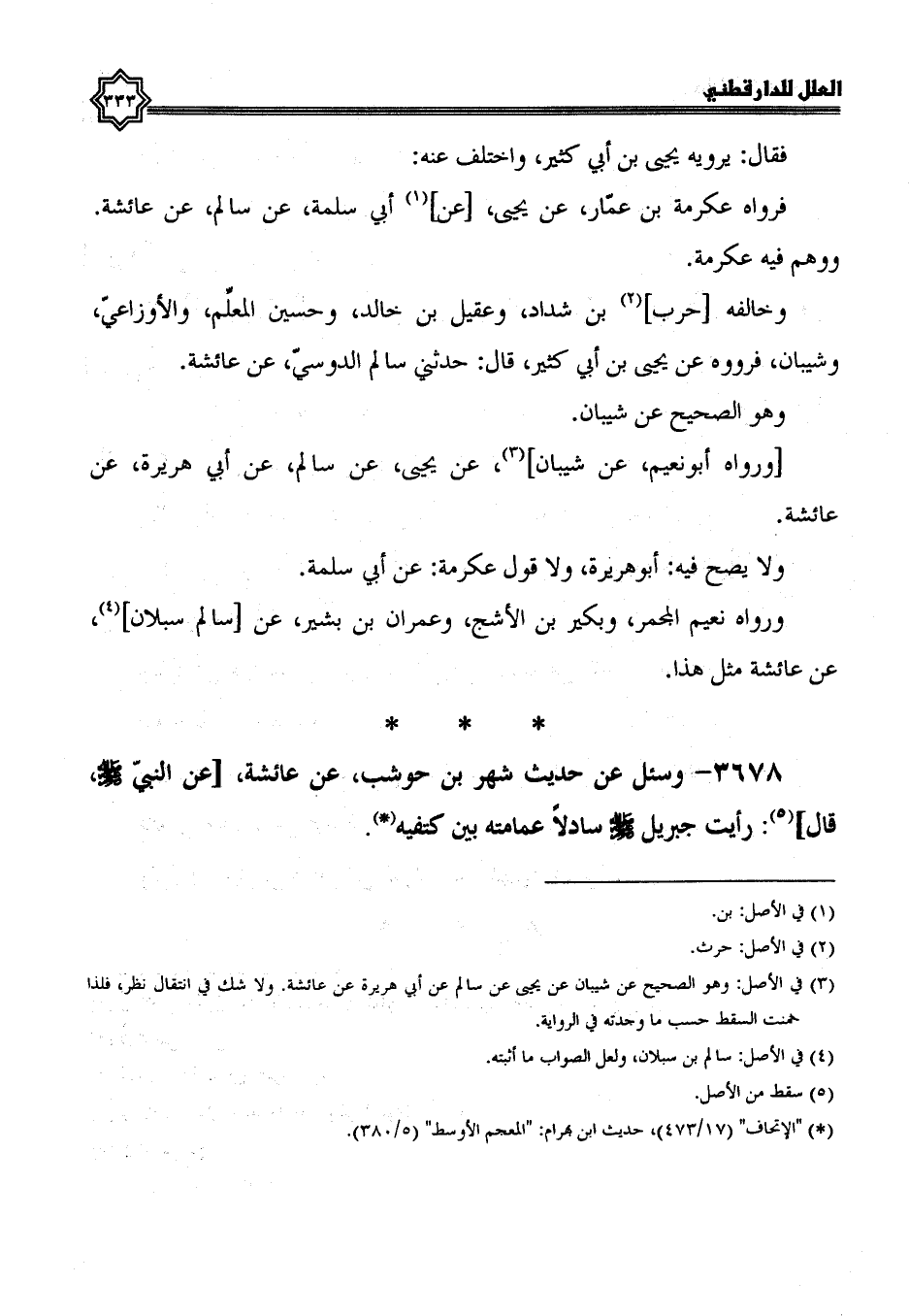 وخالفه حرب بن شداد، وعقيل بن خالد، وحسين المعلم، والأوزاعي، وشيبان، فرووه عَنْ يَحْيَى بْنِ أَبِي كَثِيرٍ، قَالَ: حَدَّثَنِي سالم الدوسي، عن عائشة، وهو الصحيح عن شيبان.