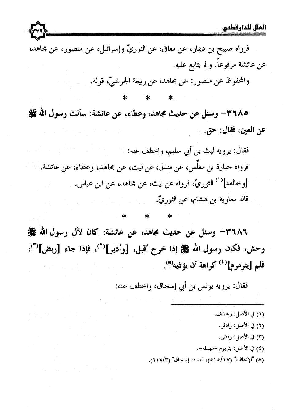 3685- وسئل عن حديث مجاهد، وعطاء، عن عائشة، سَأَلْتُ رَسُولَ اللَّهِ صَلَّى اللَّهُ عَلَيْهِ وَسَلَّمَ عن العين فقال: حق.