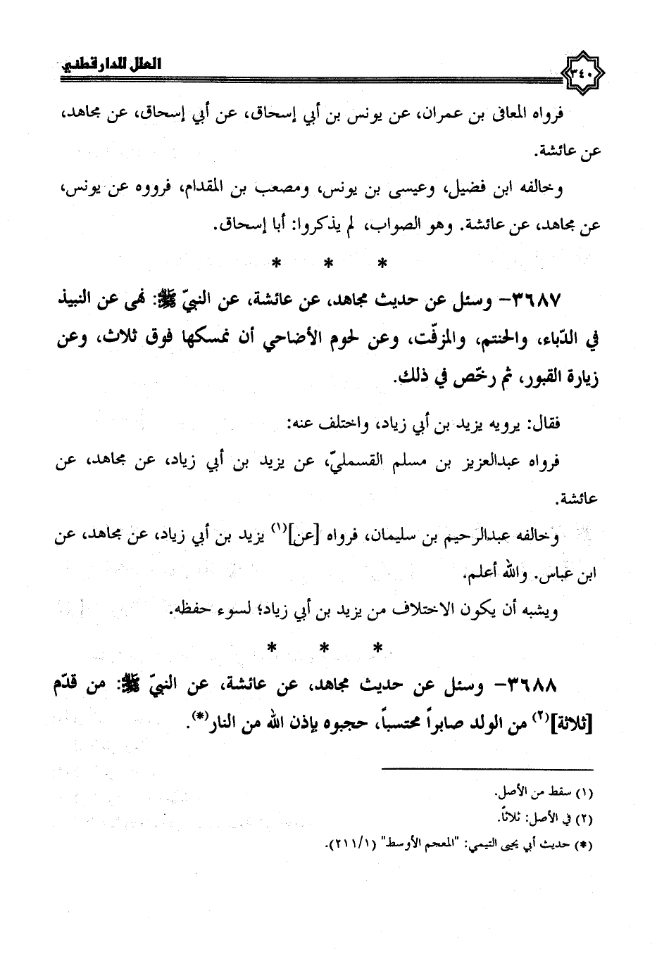 3687- وسئل عن حديث مُجَاهِدٍ، عَنْ عَائِشَةَ، عَنِ النَّبِيِّ صَلَّى اللَّهُ عَلَيْهِ وسلم نهى عن النبيذ في الدباء، والحنتم، والمزفت، وعن لحوم الأضاحي أن نمسكها فوق ثلاث، وعن زيارة القبور، ثم رخص في ذلك.