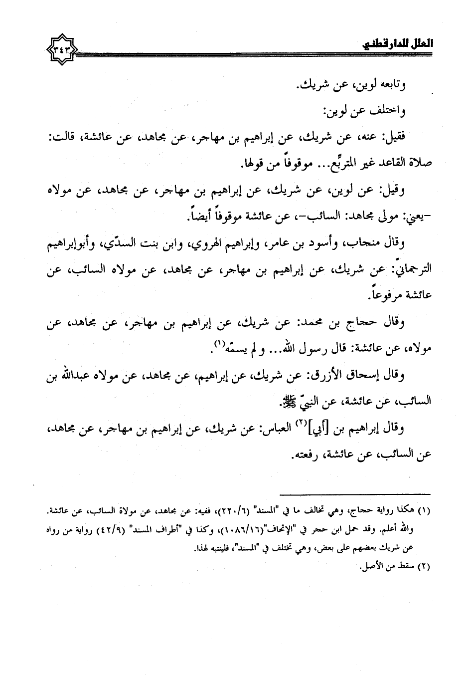 واختلف عن لوين، فقيل: عنه عن شريك، عَنْ إِبْرَاهِيمَ بْنِ مُهَاجِرٍ، عَنْ مُجَاهِدٍ، عَنْ عائشة قالت: صلاة القاعد غير المتربع ... موقوفا من قولها.