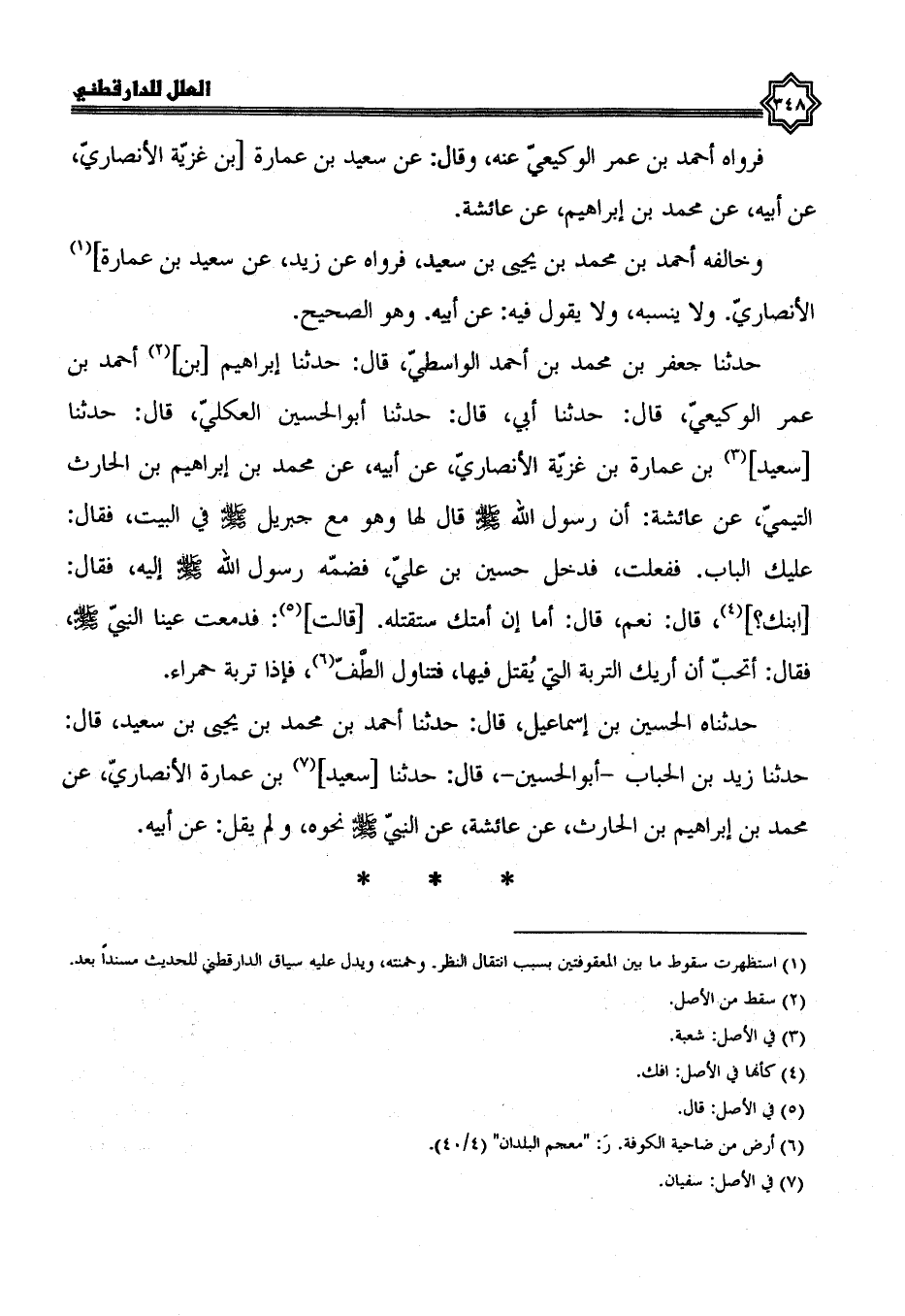وخالفه أَحْمَدُ بْنُ مُحَمَّدِ بْنِ يَحْيَى بْنِ سَعِيدٍ، فرواه عن زيد، عن سعيد بن عمارة الأنصاري، ولا ينسبه، ولا يقول فيه: عن أبيه، وهو الصحيح. حدثنا جعفر بن محمد بن أحمد الواسطي، قال: حدثنا إبراهيم بن أحمد بن عمر الوكيعي، قال: حدثنا أبي، قال: حدثنا أبو الحسين العكلي، قال: حدثنا سعيد بن عمارة بن غزية الأنصاري، عن أبيه، عَنْ مُحَمَّدِ بْنِ إِبْرَاهِيمَ بْنِ الْحَارِثِ التَّيْمِيِّ، عَنْ عائشة، أن رسول الله صلى الله عليه وسلم، قال لها وهو مع جبريل صلى الله عليه وسلم في البيت، فقال: عليك الباب ففعلت، فدخل حسين بن علي فضمه رسول الله صلى الله عليه وسلم إليه فقال: ابنك؟ قال: نعم قال: أما إن أمتك ستقتله قالت: فدمعت عينا النبي صلى الله عليه وسلم فقال أتحب أن أريك التربة التي يقتل فيها، فتناول الطف فإذا تربة حمراء حدثناه الحسين بن إسماعيل، قَالَ: حَدَّثَنَا أَحْمَدُ بْنُ مُحَمَّدِ بْنِ يَحْيَى بْنِ سَعِيدٍ، قال: حدثنا زيد بن الحباب أبو الحسين، قال: حدثنا سعيد بن عمارة الْأَنْصَارِيُّ، عَنْ مُحَمَّدِ بْنِ إِبْرَاهِيمَ بْنِ الْحَارِثِ، عَنْ عَائِشَةَ.
