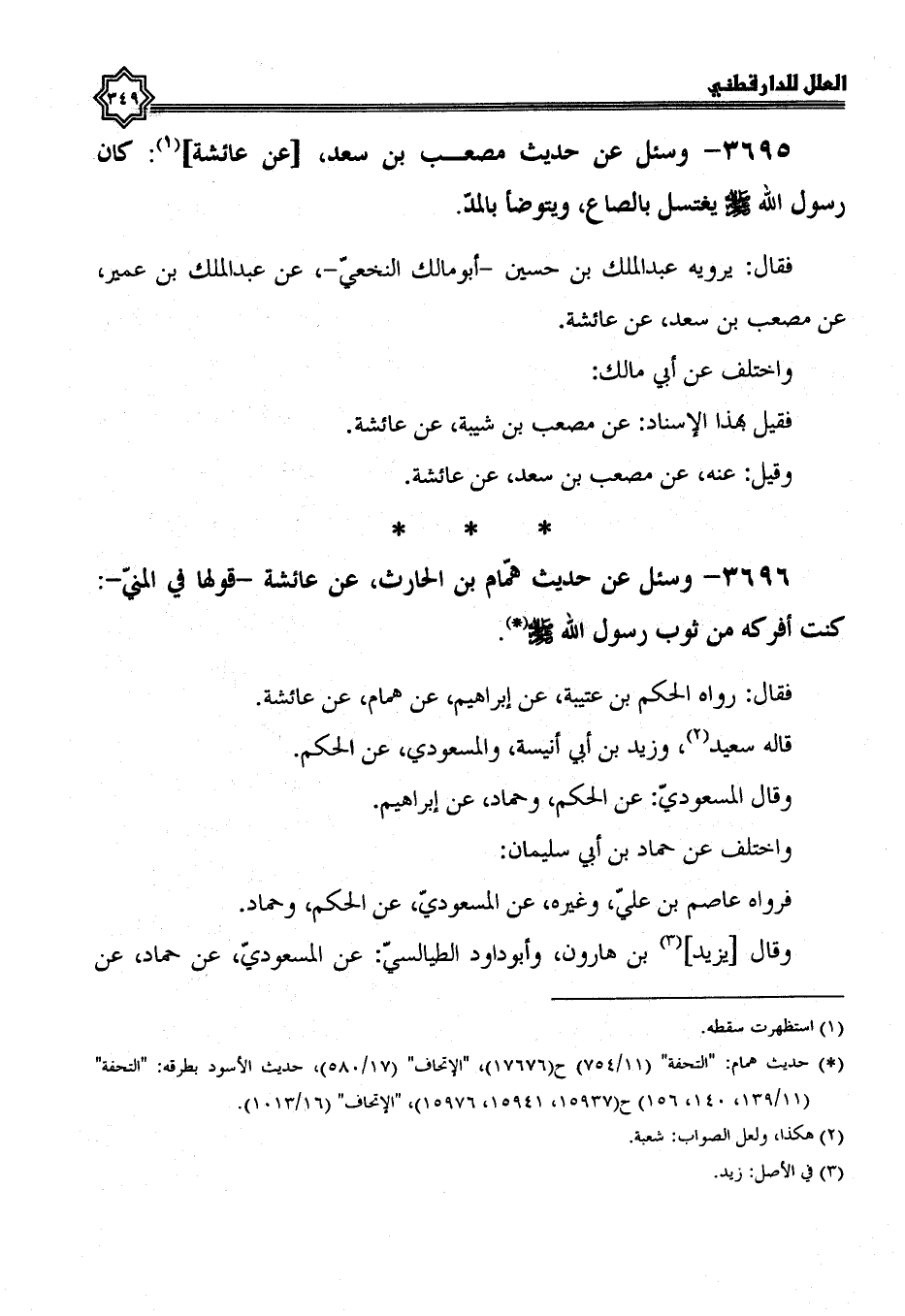 3696- وسئل عن حديث همام بن الحارث، عن عائشة، قولها في المني: كنت أفركه من ثوب رسول الله صلى الله عليه وسلم.
