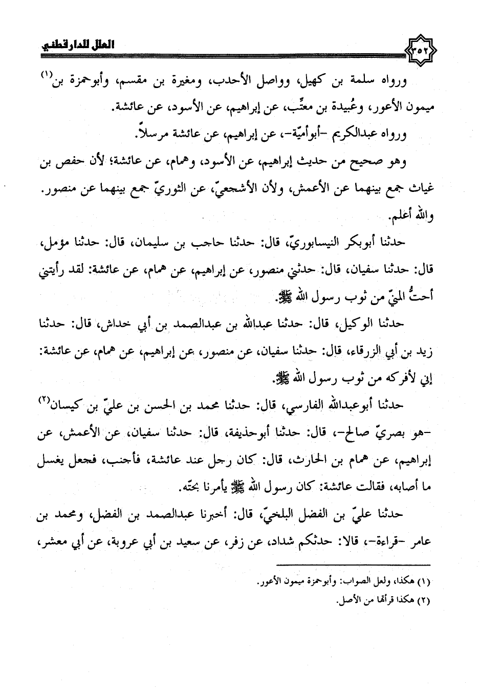 حَدَّثَنَا أبو عبد الله الفارسي، قال: حدثنا مُحَمَّدُ بْنُ الْحَسَنِ بْنِ عَلِيِّ بْنِ كَيْسَانَ، هو بصري صالح، قال: حدثنا أبو حذيفة، قال: حدثنا سفيان، عن الأعمش، عن إبراهيم، عن همام بن الحارث، قال: كان رجل عند عائشة، فأجنب فجعل يغسل ما أصابه فقالت عائشة: كَانَ رَسُولُ اللَّهِ صَلَّى اللَّهُ عَلَيْهِ وَسَلَّمَ يأمرنا بحته، حدثنا علي بن الفضل البلخي، قال: أخبرنا عَبْدُ الصَّمَدِ بْنُ الْفَضْلِ، وَمُحَمَّدُ بْنُ عَامِرٍ، قراءة، قالا حدثكم شداد، عن زفر، عن سعيد بن أبي عروبة، عن أبي معشر،