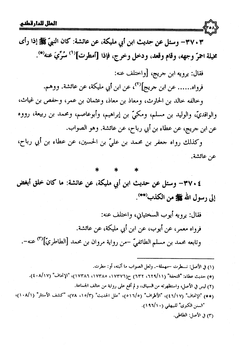 3703- وسئل عن حديث ابن أبي مليكة، عن عائشة، كَانَ النَّبِيُّ صَلَّى اللَّهُ عَلَيْهِ وَسَلَّمَ إِذَا رأى مخيلة احمر وجهه، وقام وقعد، ودخل وخرج، فإذا أمطرت سري عنه.