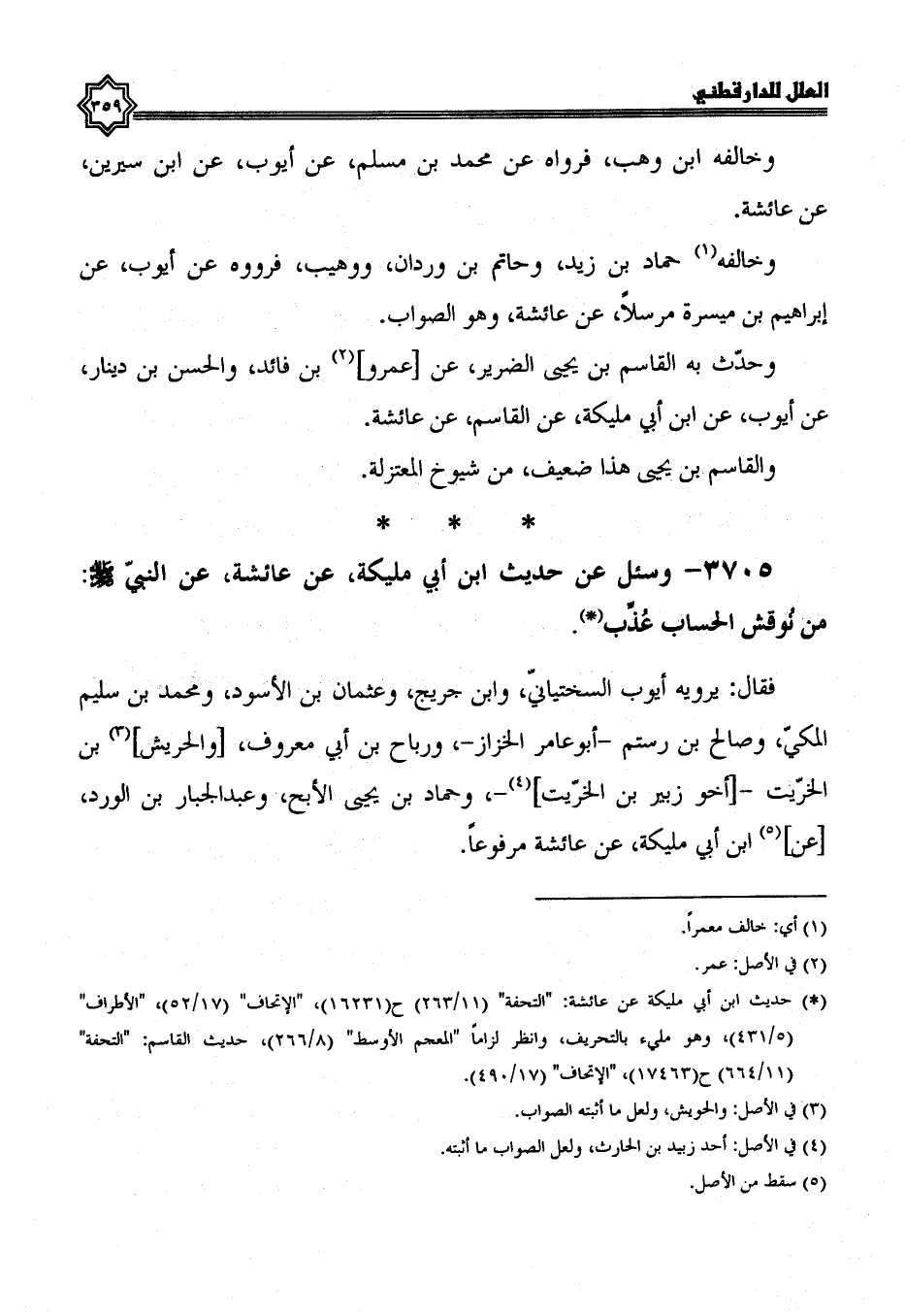 فقال: يرويه أيوب السختياني، وابن جريج، وعثمان بن الأسود، ومحمد بن سليم المكي، وصالح بن رستم أَبُو عَامِرٍ الْخَزَّازُ، وَرَبَاحُ بْنُ أَبِي مَعْرُوفٍ، والحريش بن الخريت، أخو زبير بن الخريت، وحماد بن يحيى الأبح، وَعَبْدُ الْجَبَّارِ بْنُ الْوَرْدِ، عَنِ ابْنِ أَبِي مليكة، عن عائشة، مرفوعا،