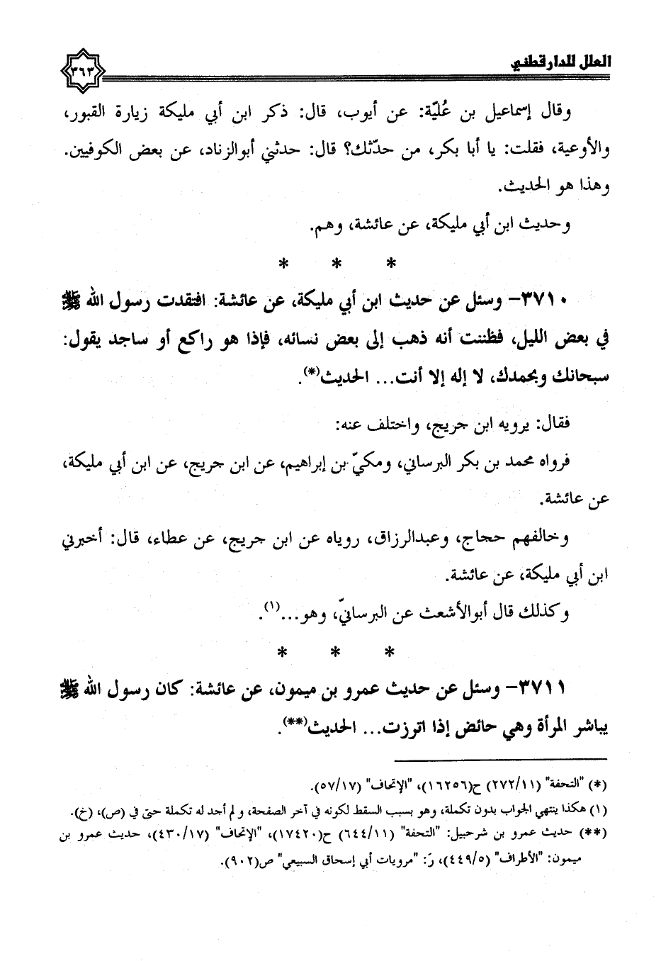 3710- وسئل عن حديث ابن أبي مليكة، عن عائشة؛ افتقدت رسول الله صلى الله عليه وسلم في بعض الليل فظننت أنه ذهب إلى بعض نسائه، فإذا هو راكع أو ساجد يقول: سبحانك، وبحمدك لا إله إلا أنت ... الْحَدِيثَ.