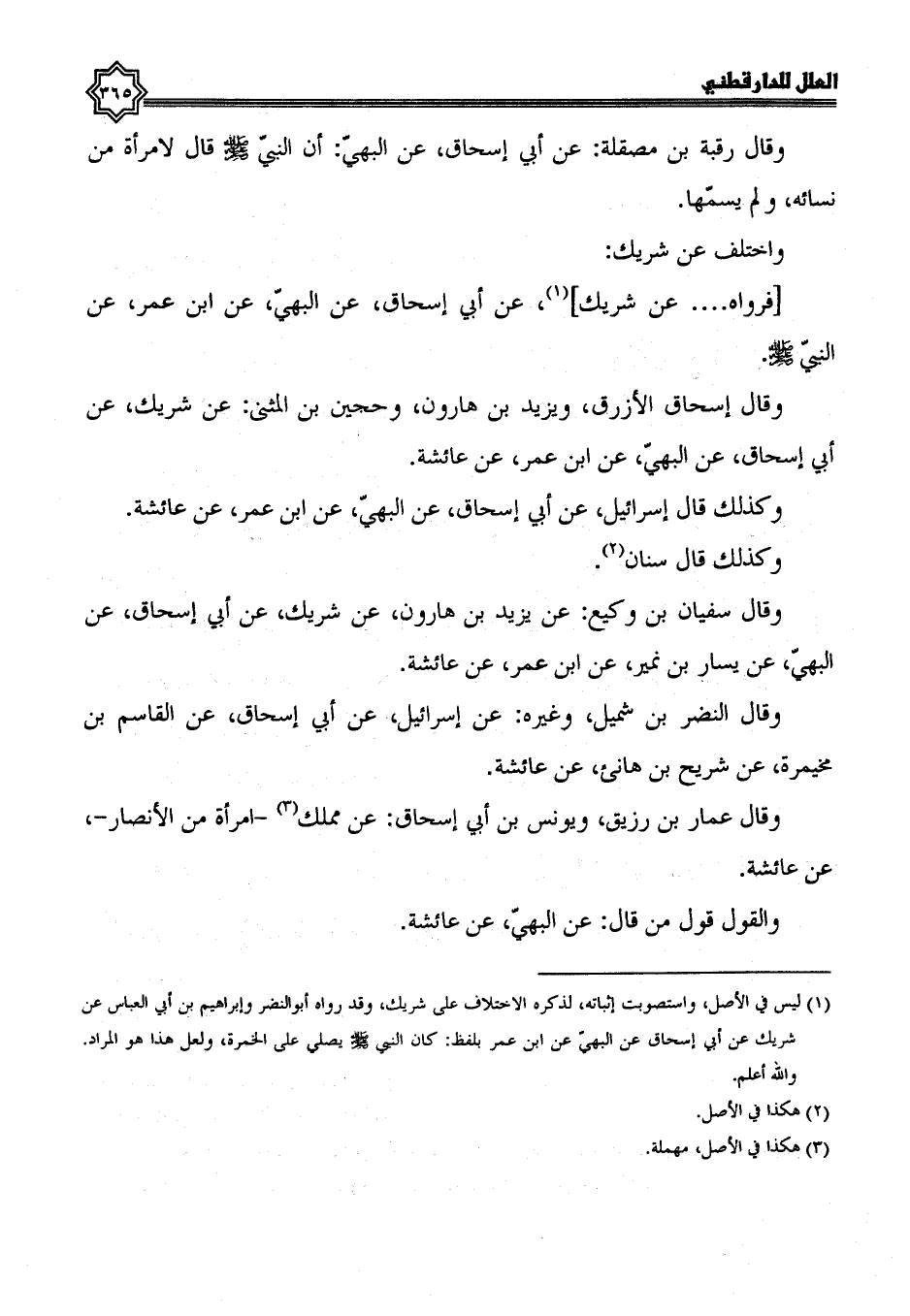 واختلف عن شريك، فرواه ... ، عن شريك، عن أبي إسحاق، عن البهي، عَنِ ابْنِ عُمَرَ، عَنِ النَّبِيِّ صَلَّى اللَّهُ عليه وسلم وقال إسحاق الأزرق: ويزيد بن هارون، وحجين بن المثنى، عن شريك، عن أبي إسحاق، عن البهي، عن ابن عمر، عن عائشة وكذلك قال إسرائيل، عن أبي إسحاق، عن البهي، عن ابن عمر، عن عائشة وكذلك قال سنان، وقال سفيان بن وكيع، عن يزيد بن هارون، عن شريك، عن أبي إسحاق، عن البهي، عن يسار بن نمير، عن ابن عمر، عن عائشة، وقال النضر بن شميل وغيره عن إسرائيل، عَنْ أَبِي إِسْحَاقَ، عَنِ الْقَاسِمِ بْنِ مُخَيْمِرَةَ، عن شريح بن هانئ، عن عائشة، وقال عمار بن رزيق، ويونس بن أبي إسحاق، عن مملك امرأة من الأنصار، عن عائشة، والقول قول من قال عن البهي عن عائشة
