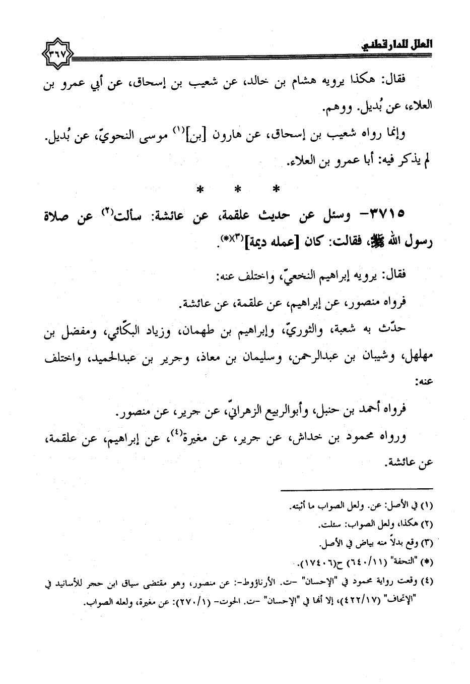 3715- وسئل عن حديث علقمة، عن عائشة؛ سألت عن صَلَاةَ رَسُولِ اللَّهِ صَلَّى اللَّهُ عَلَيْهِ وَسَلَّمَ، فقالت: كان عمله ديمة.