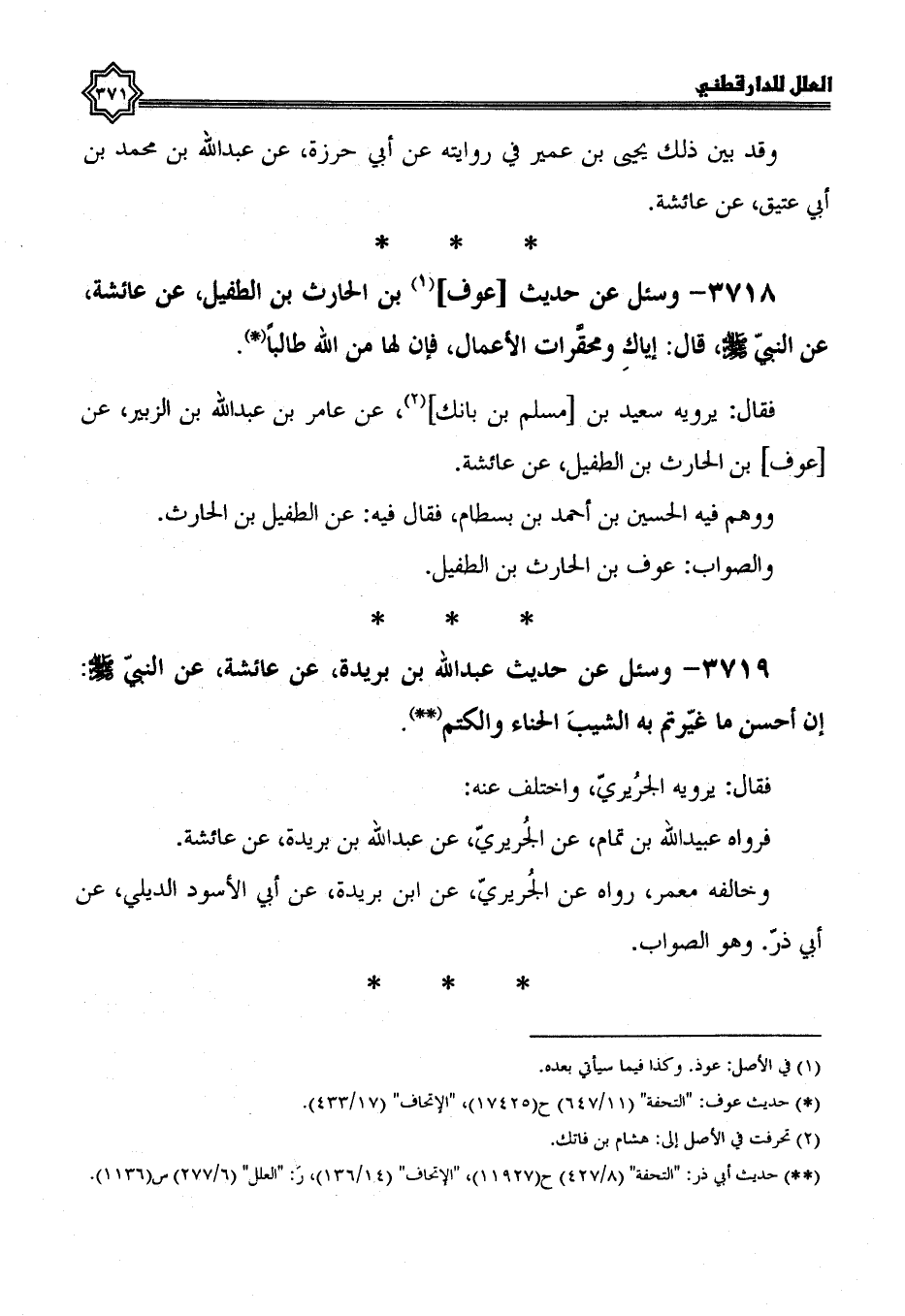 3718- وسئل عن حديث عوف بن الحارث بن الطفيل، عَنْ عَائِشَةَ، عَنِ النَّبِيِّ صَلَّى اللَّهُ عَلَيْهِ وسلم، قال: إياك ومحقرات الأعمال، فإن لها من الله طالبا.