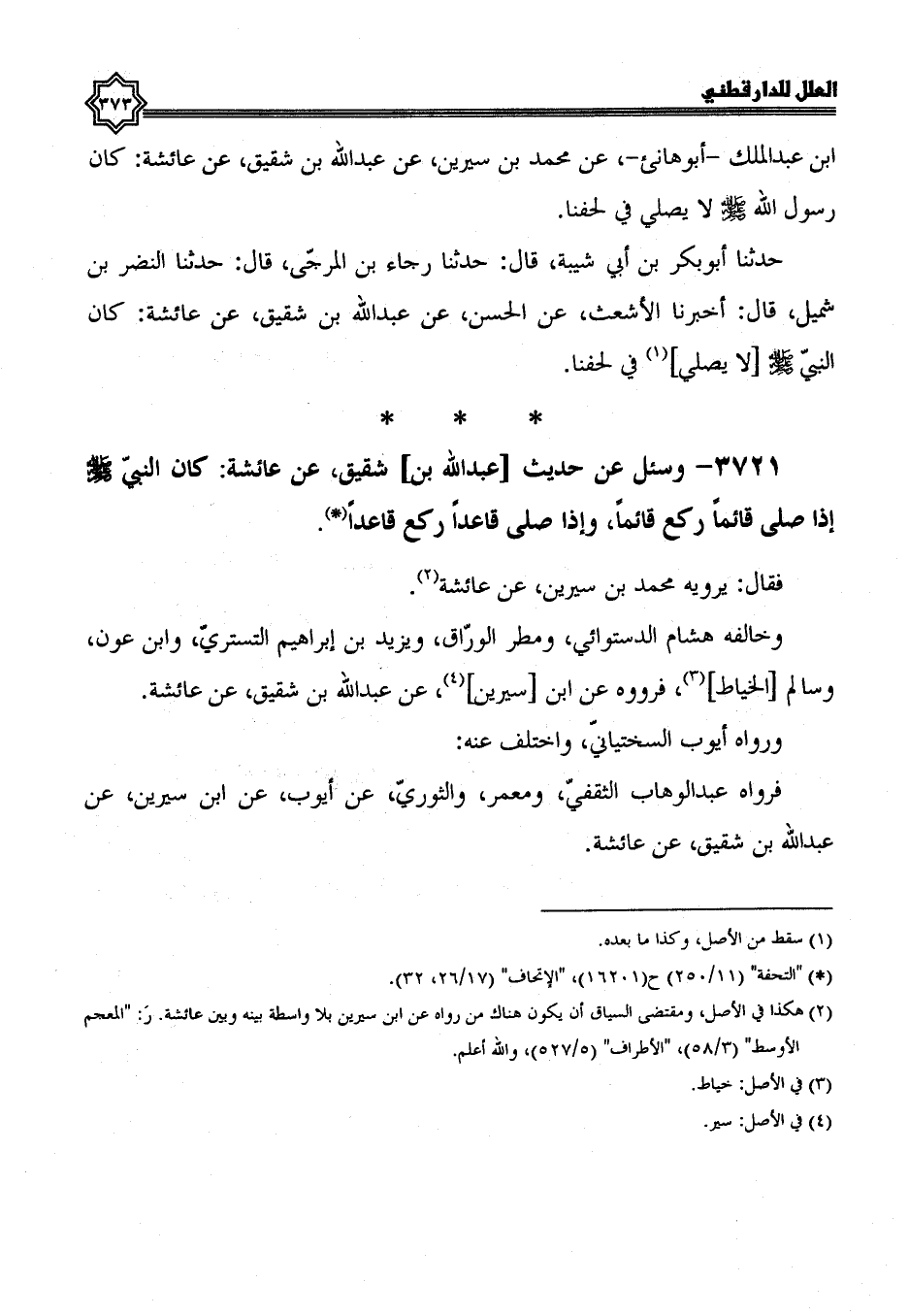 3721- وَسُئِلَ عَنْ حَدِيثِ عَبْدِ اللَّهِ بْنِ شَقِيقٍ، عن عائشة، كَانَ النَّبِيُّ صَلَّى اللَّهُ عَلَيْهِ وَسَلَّمَ إِذَا صلى قائما ركع قائما، وإذا صلى قاعدا ركع قاعدا.
