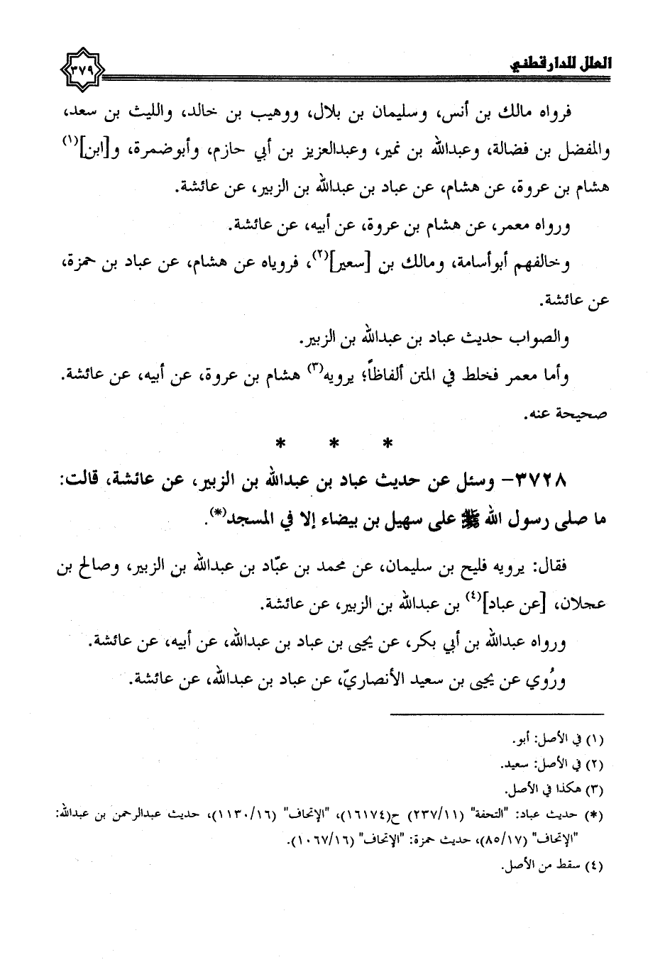 3728- وَسُئِلَ عَنْ حَدِيثِ عَبَّادِ بْنِ عَبْدِ اللَّهِ بن الزبير، عن عائشة قالت: ما صَلَّى رَسُولُ اللَّهِ صَلَّى اللَّهُ عَلَيْهِ وَسَلَّمَ على سهيل بن بيضاء إلا في المسجد.
