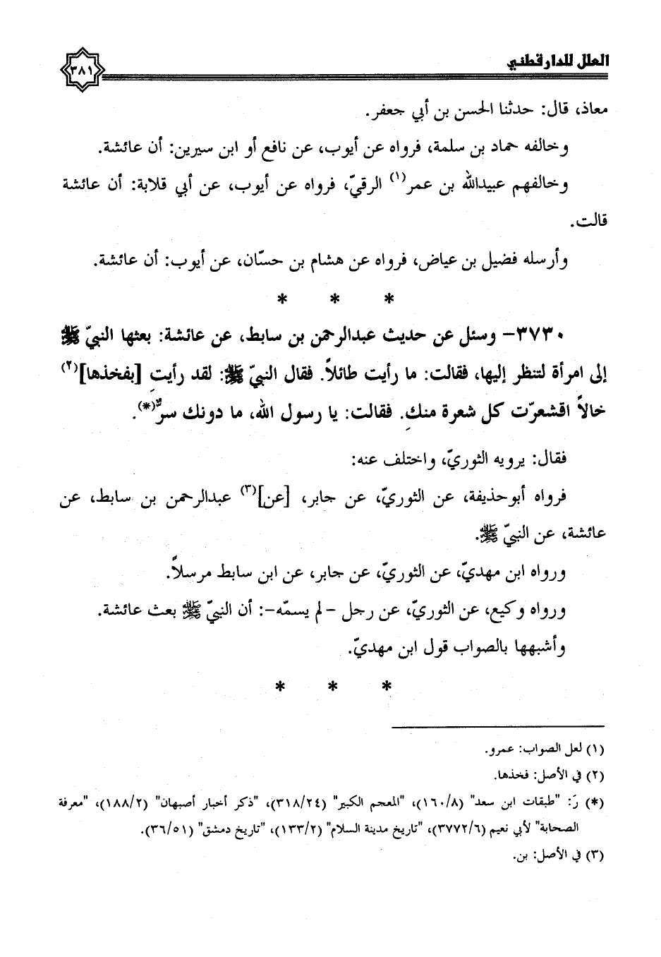3730- وسئل عن حديث عبد الرحمن بن سابط، عن عائشة، بعثها النبي صلى الله عليه وسلم إلى امرأة لتنظر إليها، فقالت: ما رأيت طائلا، فقال النبي صلى الله عليه وسلم: لقد رأيت بفخذها خالا اقشعرت كل شعرة منك فقالت: يا رسول الله ما دونك سر.