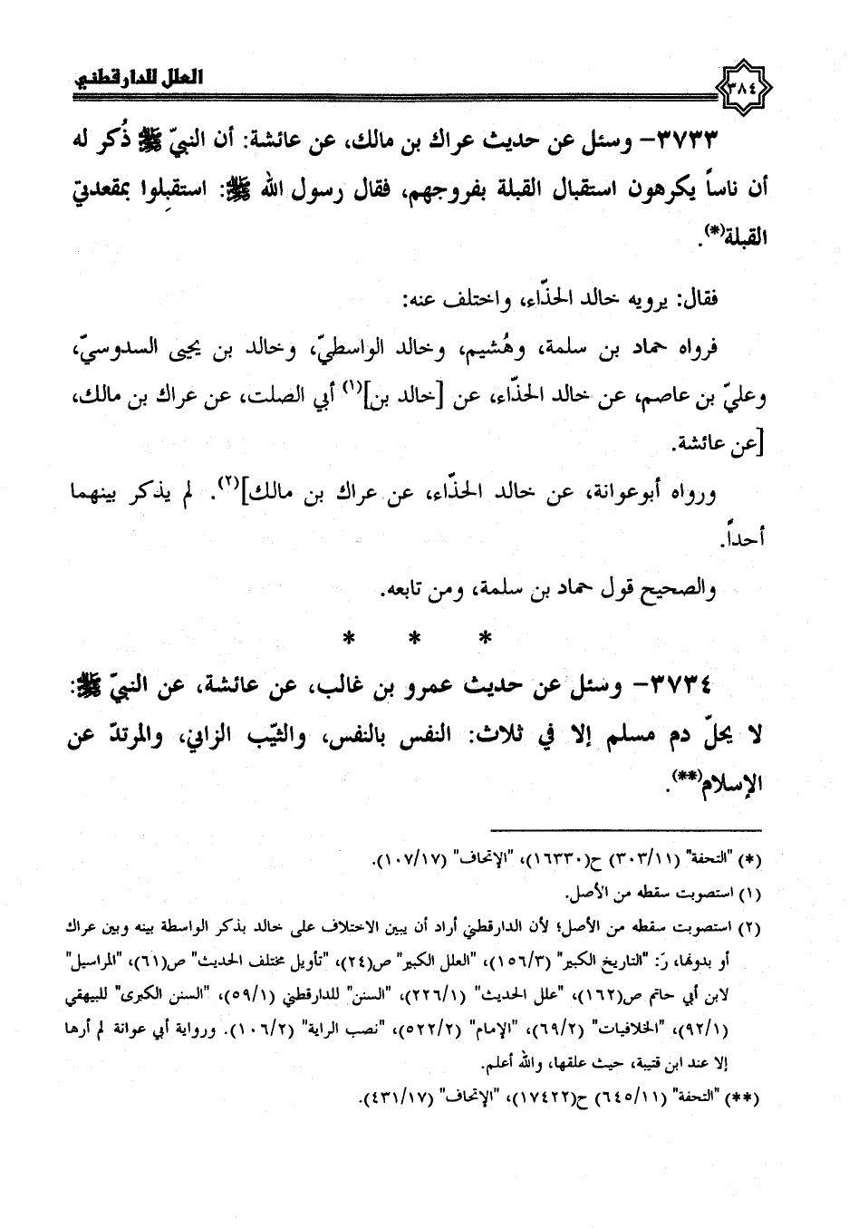 3733- وسئل عن حديث عراك بن مالك، عن عائشة، أن النبي صلى الله عليه وسلم ذكر له أن ناسا يكرهون استقبال القبلة بفروجهم، فَقَالَ رَسُولُ اللَّهِ صَلَّى اللَّهُ عَلَيْهِ وَسَلَّمَ: استقبلوا بمقعدتي القبلة.
