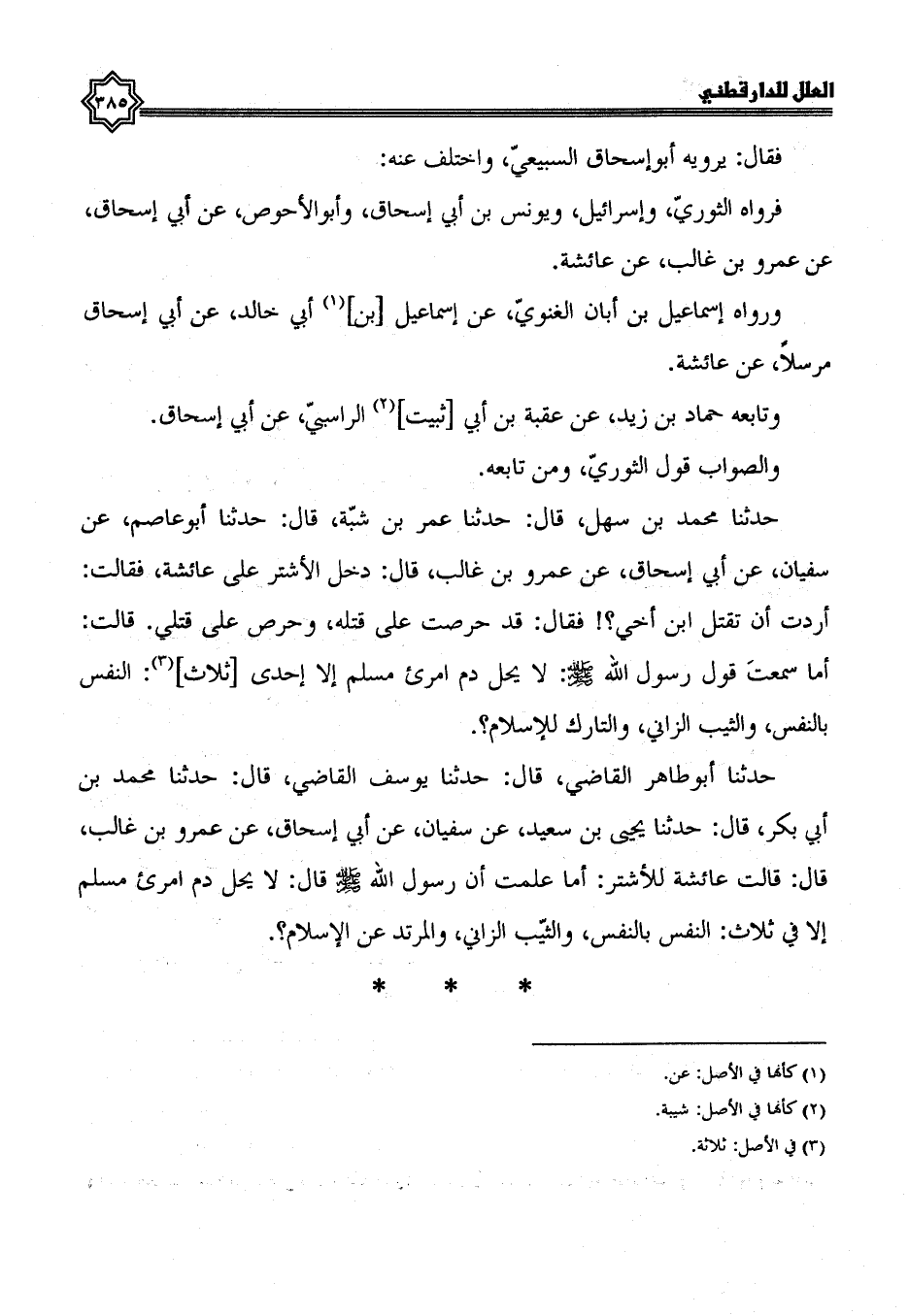 حدثنا أبو طاهر القاضي، قال: حدثنا يوسف القاضي، قال: حدثنا محمد بن أبي بكر، قال: حدثنا يحيى بن سعيد، عَنْ سُفْيَانَ، عَنْ أَبِي إِسْحَاقَ، عَنْ عَمْرِو بن غالب، قال: قالت عائشة للأشتر: أما عَلِمْتُ أَنَّ رَسُولَ اللَّهِ صَلَّى اللَّهُ عَلَيْهِ وسلم، قال: لا يحل دم امرئ مسلم إلا في ثلاث: النفس بالنفس، والثيب الزاني، والمرتد عن الإسلام.