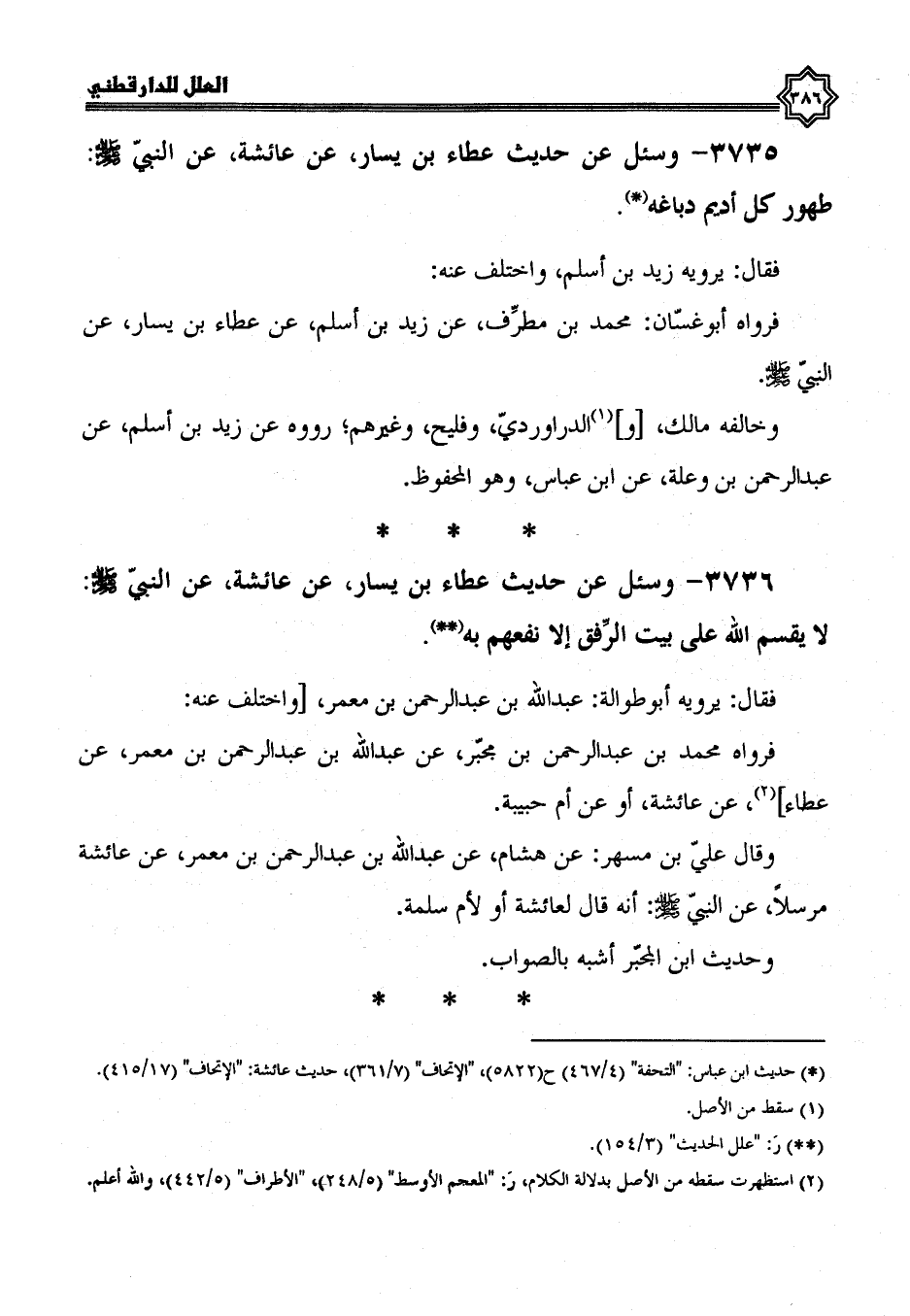 3735- وَسُئِلَ عَنْ حَدِيثِ عَطَاءِ بْنِ يَسَارٍ، عَنْ عَائِشَةَ، عَنِ النَّبِيِّ صَلَّى اللَّهُ عَلَيْهِ وَسَلَّمَ: طهور كل أديم دباغه.