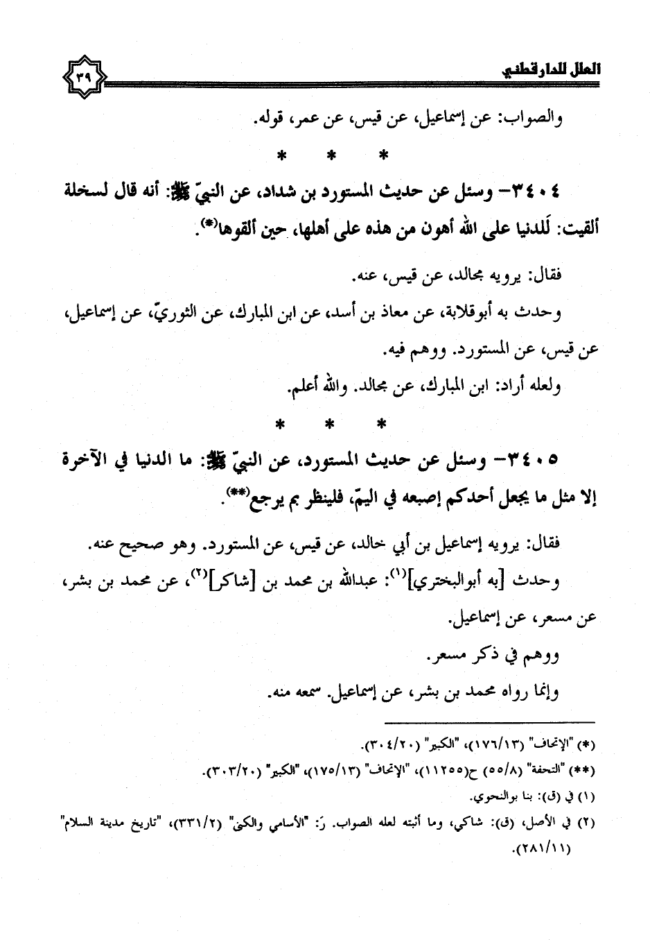 فَقَالَ: يَرْوِيهِ إِسْمَاعِيلُ بْنُ أَبِي خَالِدٍ، عَنْ قَيْسٍ، عَنْ المستورد، وهو صحيح عنه، وحدث به أبو البختري عبد الله بن محمد بن شاكر، عَنْ مُحَمَّدِ بْنِ بِشْرٍ، عَنْ مِسْعَرٍ، عَنْ إسماعيل، ووهم في ذكر مسعر، وإنما رواه محمد بن بشر، عن إسماعيل، سمعه منه،