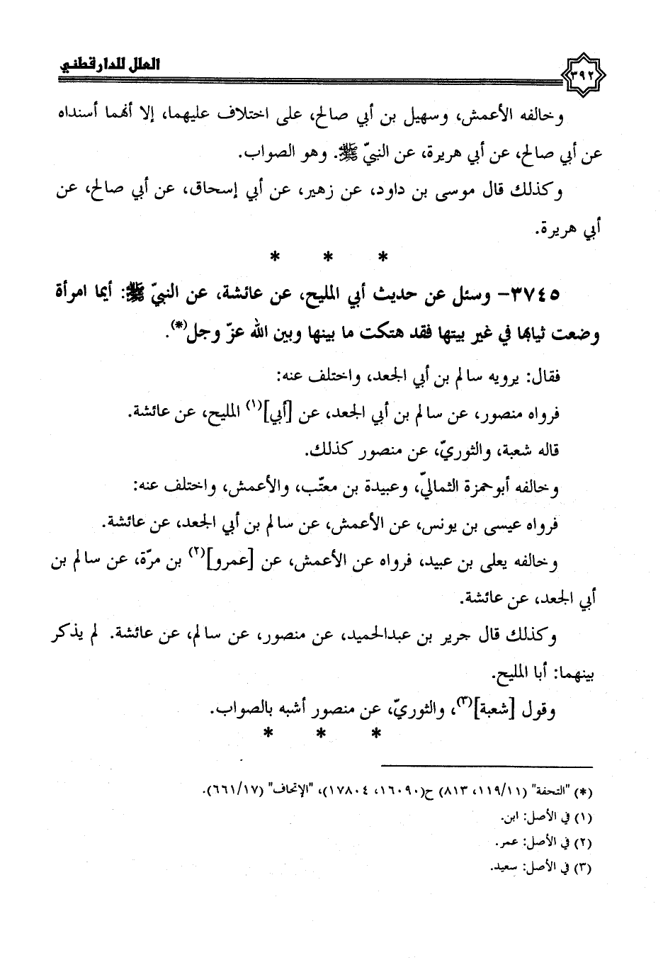 فَرَوَاهُ عَنِ الْأَعْمَشِ، عَنْ عَمْرِو بْنِ مُرَّةَ، عَنْ سالم بن أبي الجعد، عن عائشة وَكَذَلِكَ قَالَ: جَرِيرُ بْنُ عَبْدِ الْحَمِيدِ، عَنْ منصور، عن سالم، عن عائشة، لم يذكر بينهما أبا المليح، وقول شعبة، والثوري، عن منصور، أشبه بالصواب.