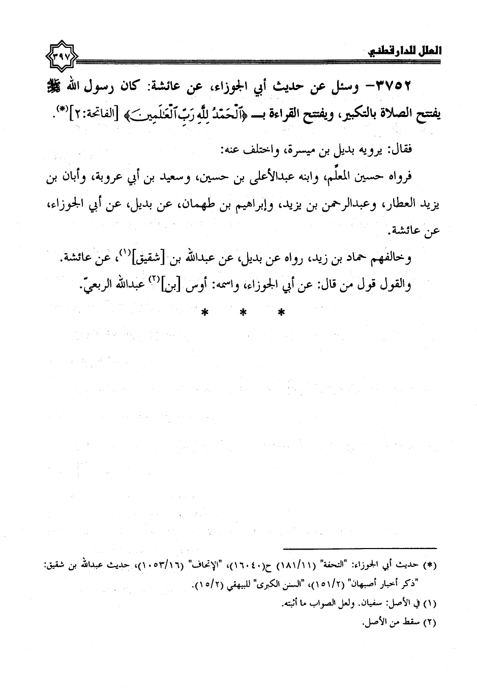 3752- وسئل عن حديث أبي الجوزاء، عن عائشة، كَانَ رَسُولُ اللَّهِ صَلَّى اللَّهُ عَلَيْهِ وَسَلَّمَ يفتتح الصلاة بالتكبير، ويفتتح القراءة بـ {الحمد لله رب العالمين} .