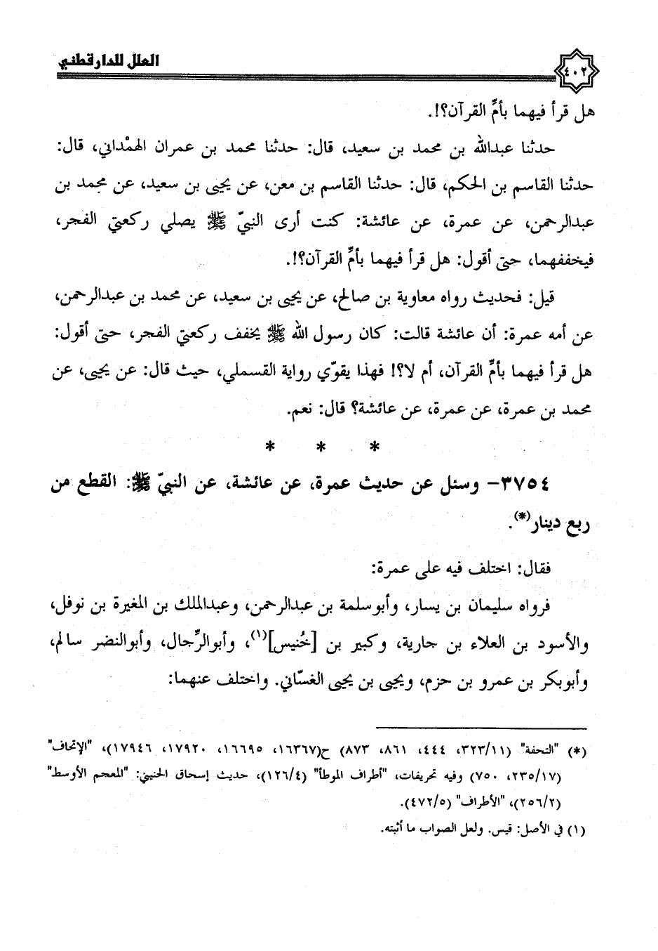 قيل فحديث رواه مُعَاوِيَةُ بْنُ صَالِحٍ، عَنْ يَحْيَى بْنِ سَعِيدٍ، عَنْ مُحَمَّدِ بْنِ عبد الرحمن، عن أمه عمرة، أن عائشة قالت: كَانَ رَسُولُ اللَّهِ صَلَّى اللَّهُ عَلَيْهِ وَسَلَّمَ يخفف ركعتي الفجر، حتى أقول هل قرأ فيهما بأم القرآن أم لا؟ فهذا يقوي رواية القسملي حيث قال: عن يحيى، عن محمد بن عمرة، عن عمرة، عن عائشة، قال: نعم.