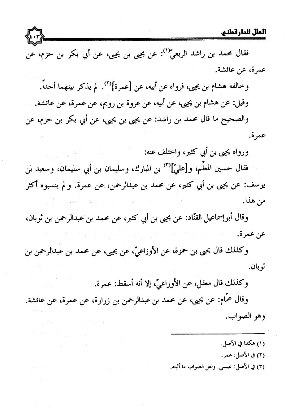 وقيل: عن هشام بن يحيى، عن أبيه، عن عروة بن رويم، عن عمرة، عن عائشة والصحيح ما قال: محمد بن راشد، عن يحيى بن يحيى، عن أبي بكر بن حزم، عن عمرة.