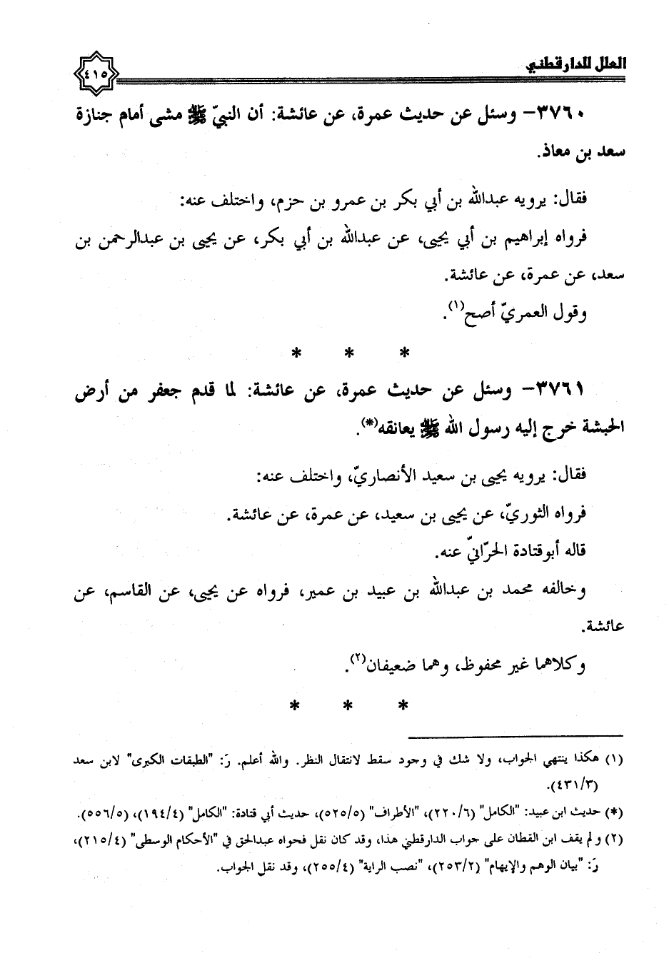 3760- وسئل عن حديث عَمْرَةَ، عَنْ عَائِشَةَ، أَنَّ النَّبِيَّ صَلَّى اللَّهُ عليه وسلم مشى أمام جنازة سعد بن معاذ.