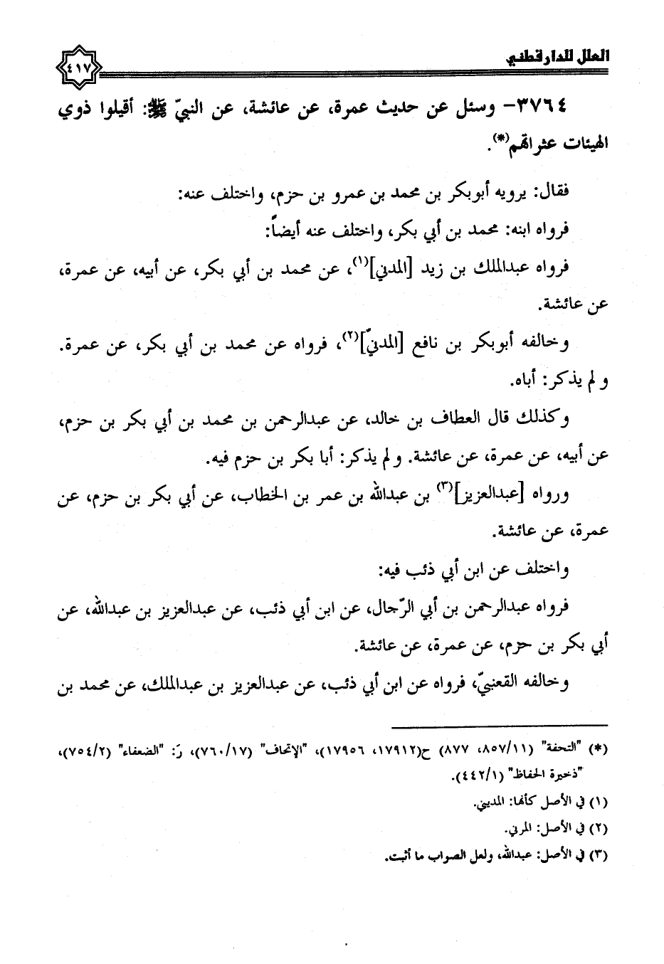3764- وسئل عن حديث عمرة، عَنْ عَائِشَةَ، عَنِ النَّبِيِّ صَلَّى اللَّهُ عَلَيْهِ وسلم: أقيلوا ذوي الهيئات عثراتهم.