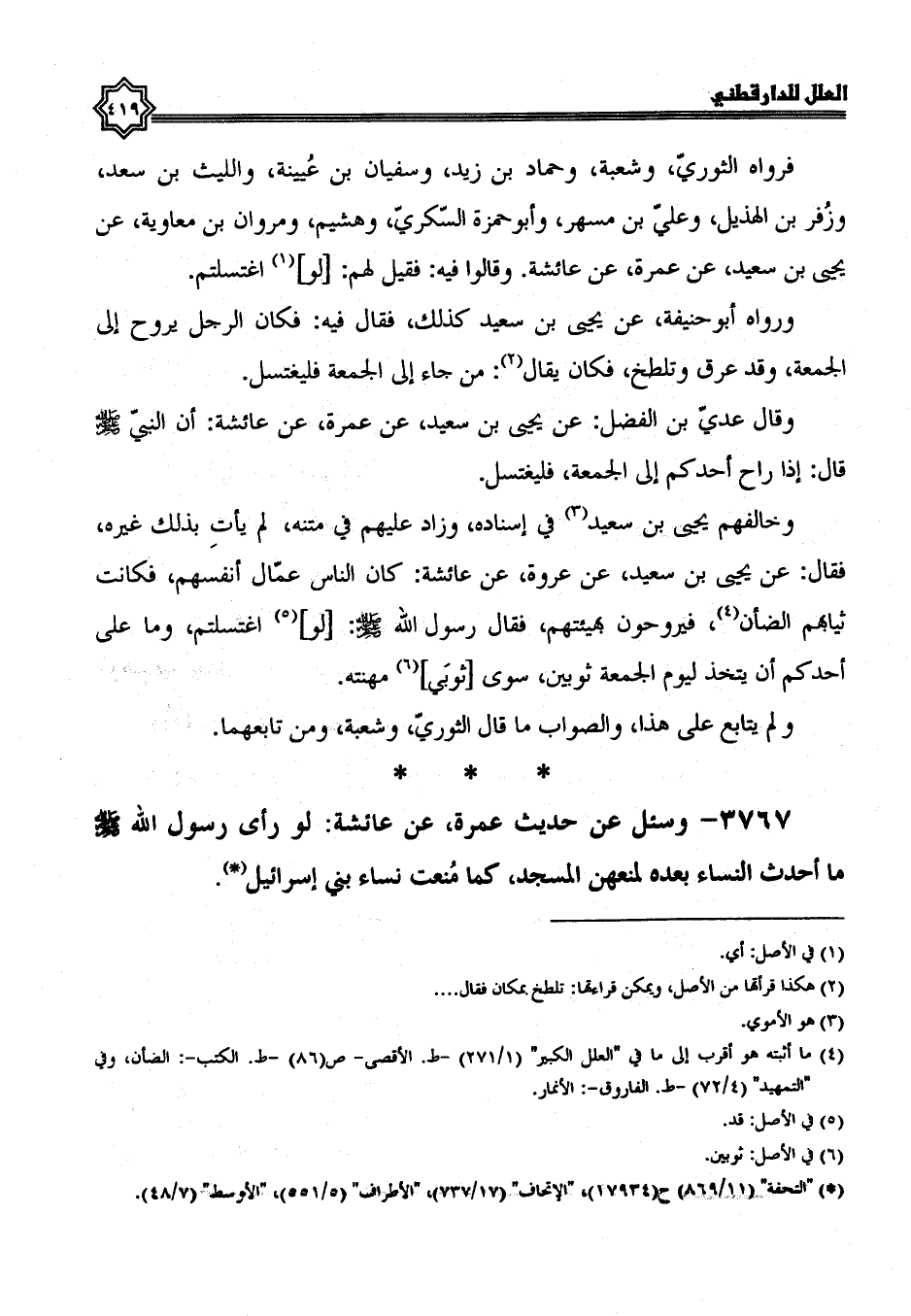 وقال عدي بن الفضل: عَنْ يَحْيَى بْنِ سَعِيدٍ، عَنْ عَمْرَةَ، عَنْ عائشة؛ أن النبي صلى الله عليه وسلم قال: إذا راح أحدكم إلى الجمعة، فليغتسل.