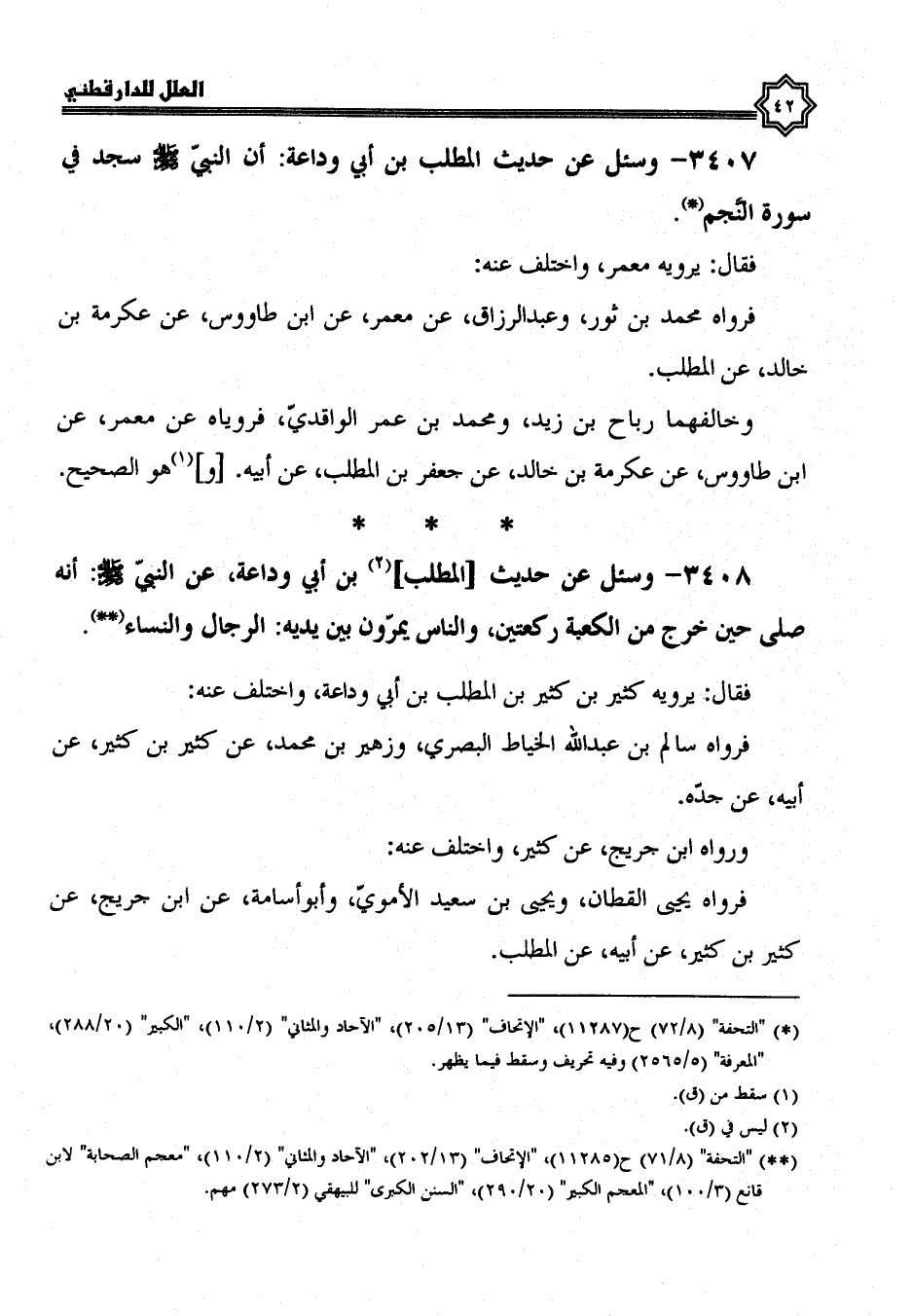 3407- وسئل عن حديث المطلب بن أبي وداعة، أَنّ النَّبِيَّ صَلَّى اللَّهُ عَلَيْهِ وَسَلَّمَ سَجَدَ في سورة النجم.
