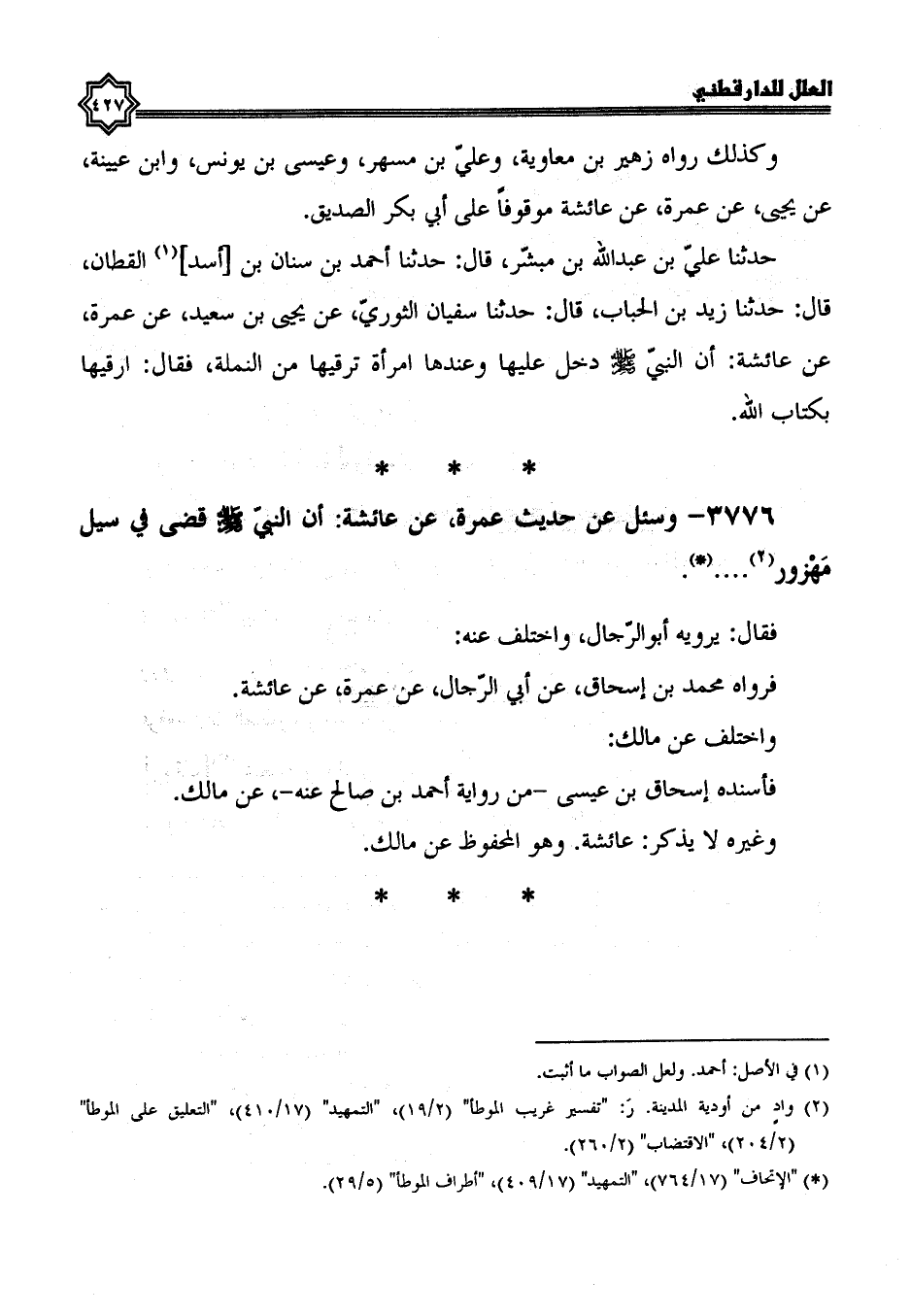 3776- وسئل عن حديث عَمْرَةَ، عَنْ عَائِشَةَ أَنَّ النَّبِيَّ صَلَّى اللَّهُ عَلَيْهِ وَسَلَّمَ قَضَى في سيل مهزور ...