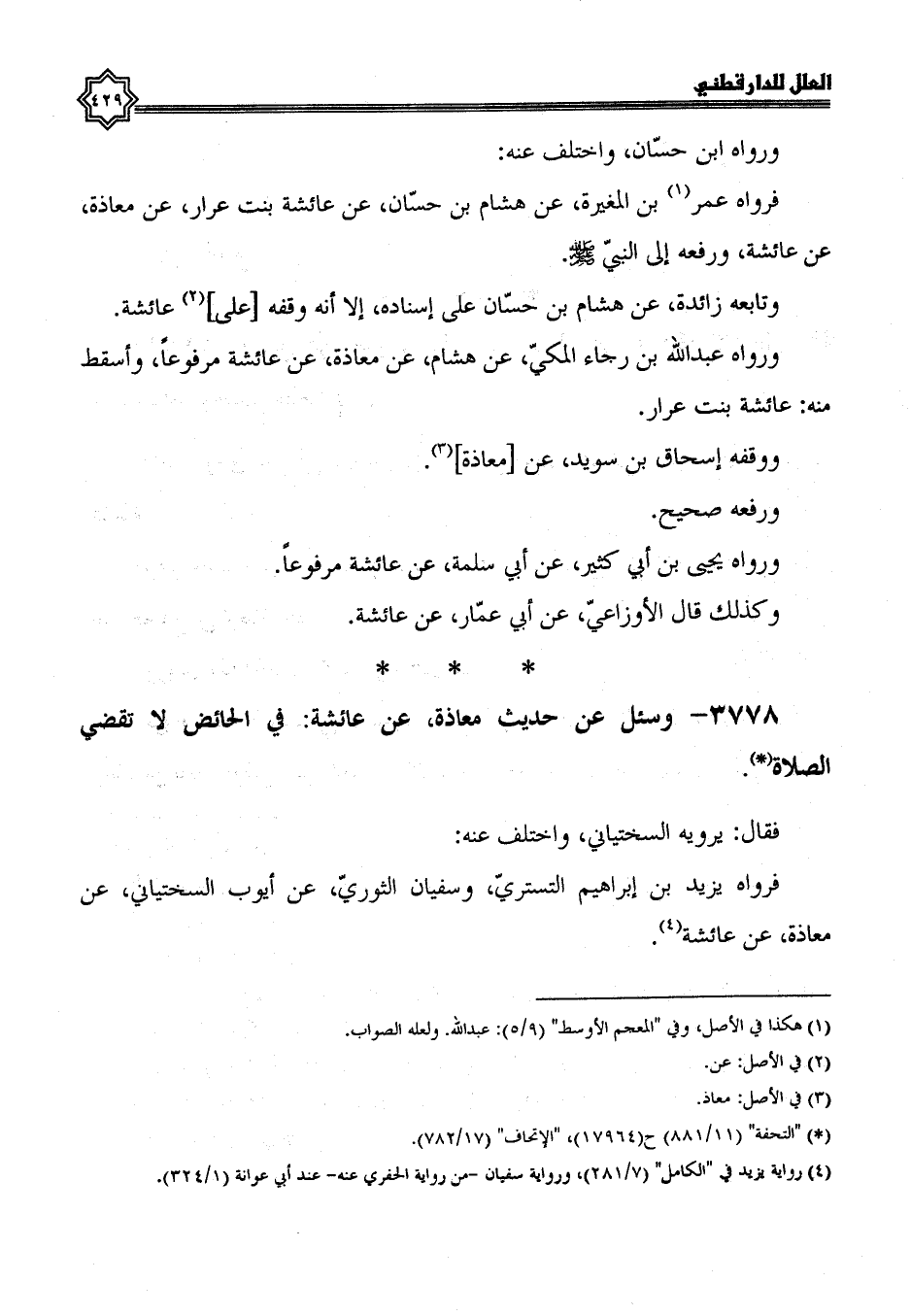 3778- وسئل عن حديث معاذة، عن عائشة في الحائض لا تقضي الصلاة.