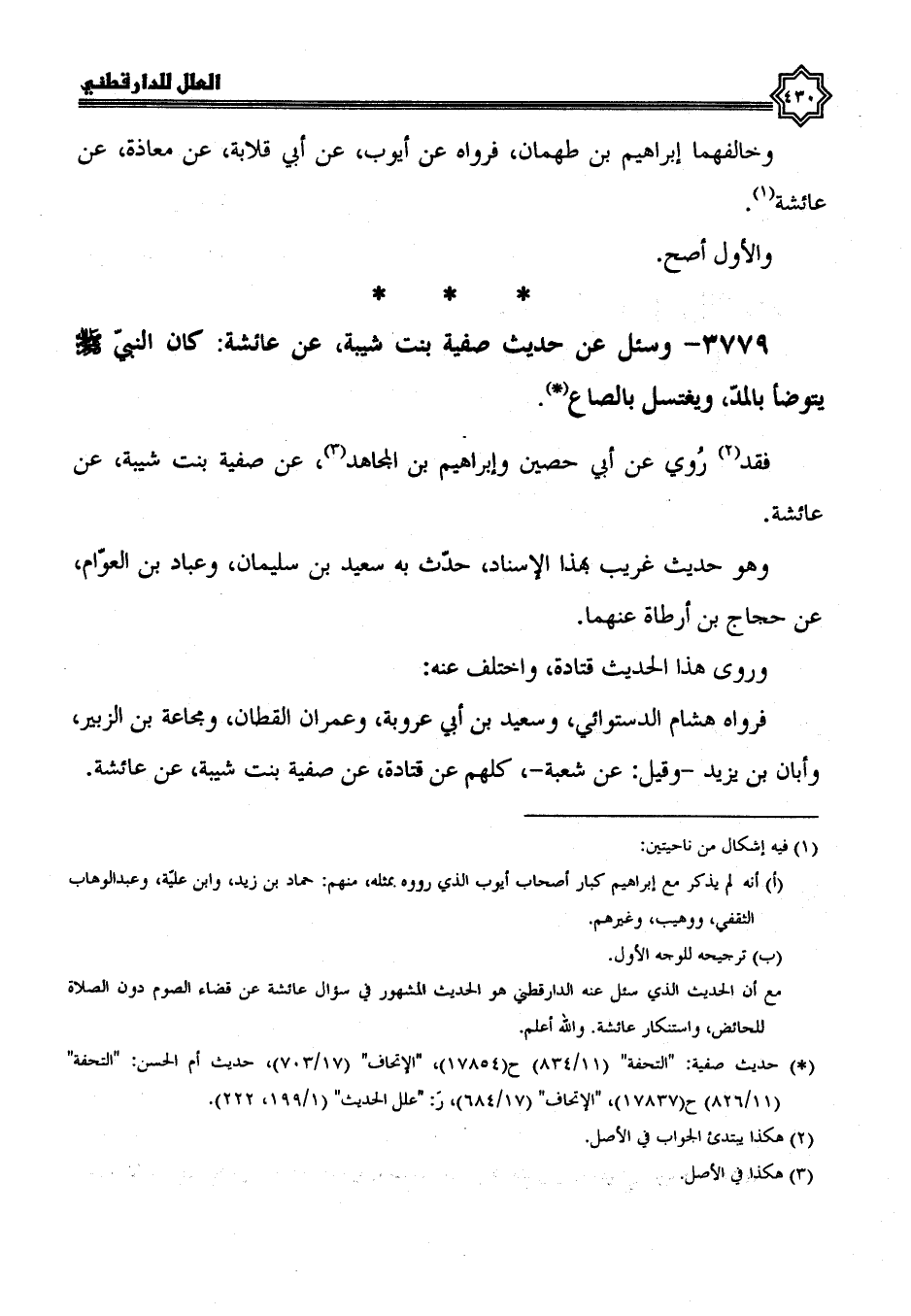 3779- وسئل عن حديث صفية بنت شيبة، عن عائشة كَانَ النَّبِيُّ صَلَّى اللَّهُ عَلَيْهِ وَسَلَّمَ، يَتَوَضَّأُ بالمد، ويغتسل بالصاع.