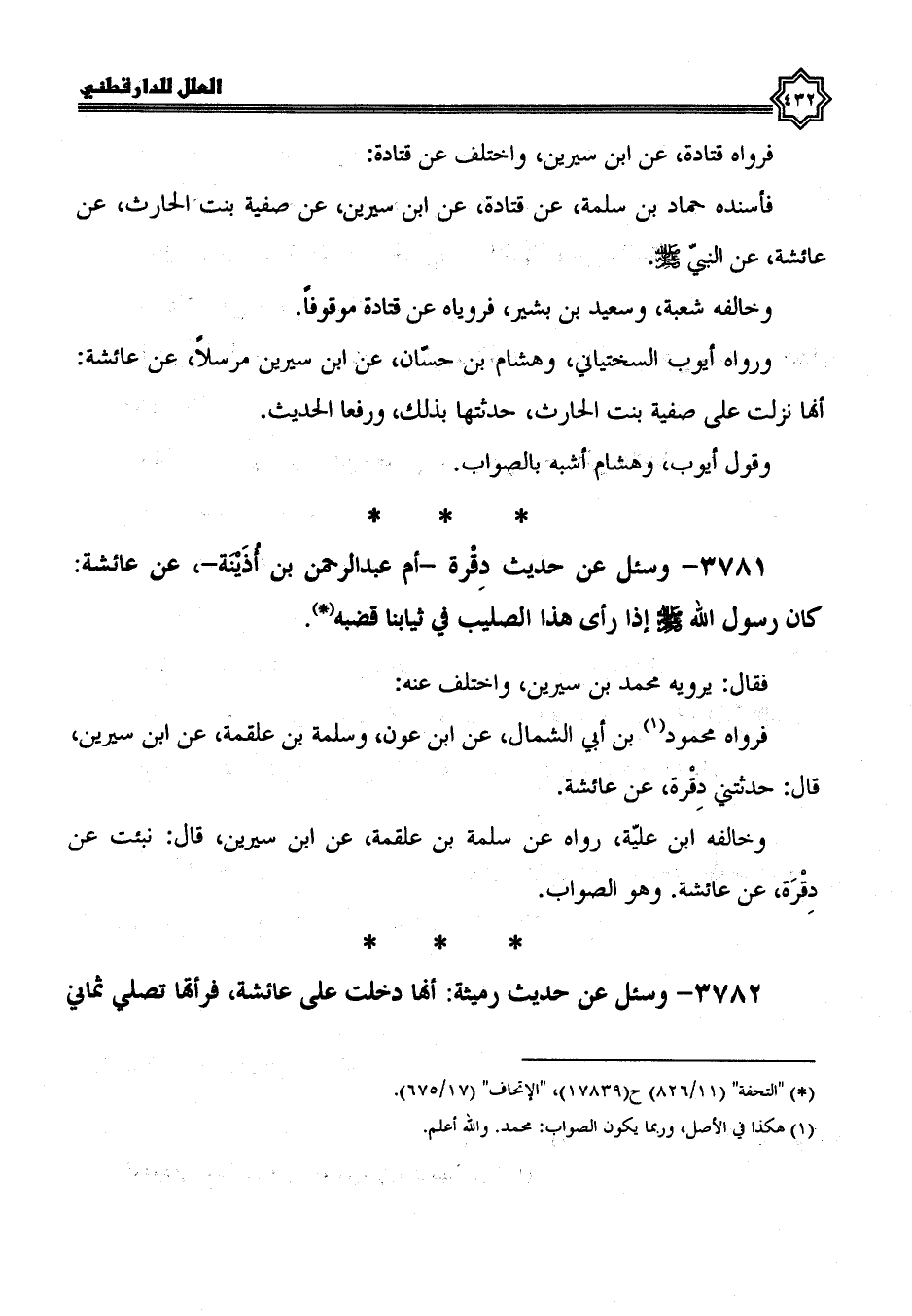 وخالفه، ابن علية، رواه عَنْ سَلَمَةُ بْنُ عَلْقَمَةَ، عَنِ ابْنِ سِيرِينَ، قَالَ: نبئت عن دقرة، عَنْ عَائِشَةَ، وَهُوَ الصَّوَابُ.