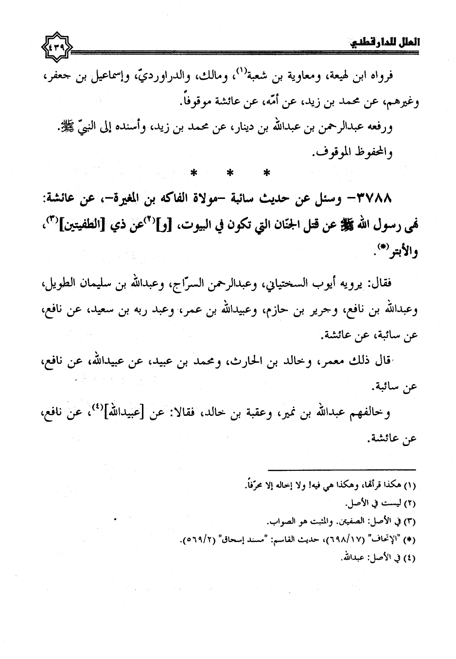 3788- وسئل عن حديث سائبة مولاة الفاكه بن المغيرة، عن عائشة؛ نَهَى رَسُولُ اللَّهِ صَلَّى اللَّهُ عَلَيْهِ وَسَلَّمَ عن قتل الجنان التي تكون في البيوت، غير (1) ذي الطفيتين، والأبتر.