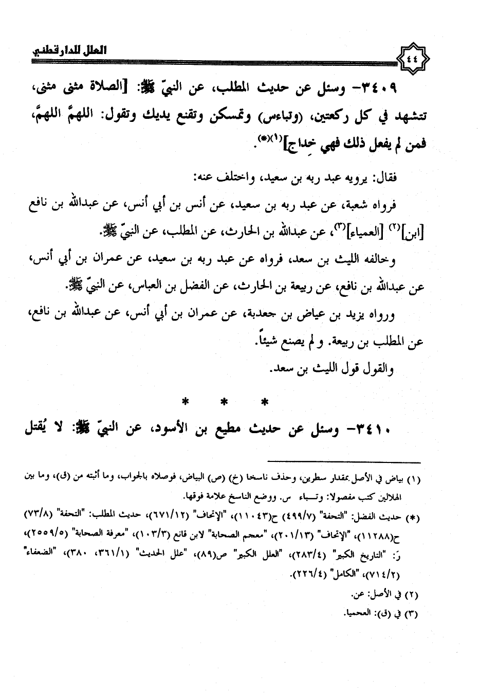 3409- وسئل عن حديث المطلب، عن النبي صلى الله عليه وسلم: الصلاة مثنى مثنى، تتشهد في كل ركعتين، (وتباءس) وتمسكن وتقنع يديك وتقول: اللهم اللهم، فمن لم يفعل ذلك فهي خداج.
