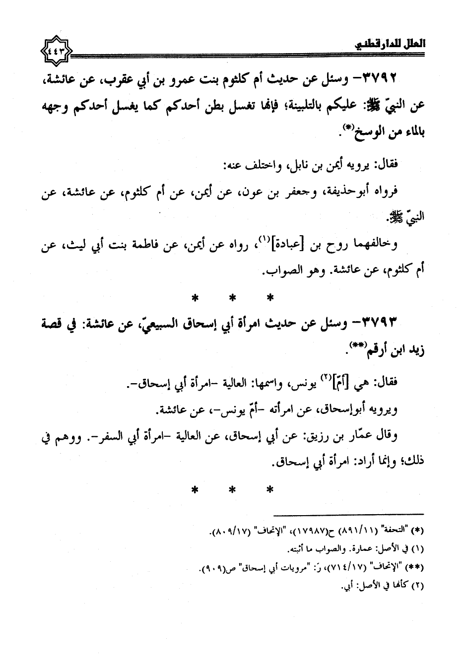 3793- وسئل عن حديث امرأة أبي إسحاق السبيعي، عن عائشة، في قصة زيد بن أرقم.