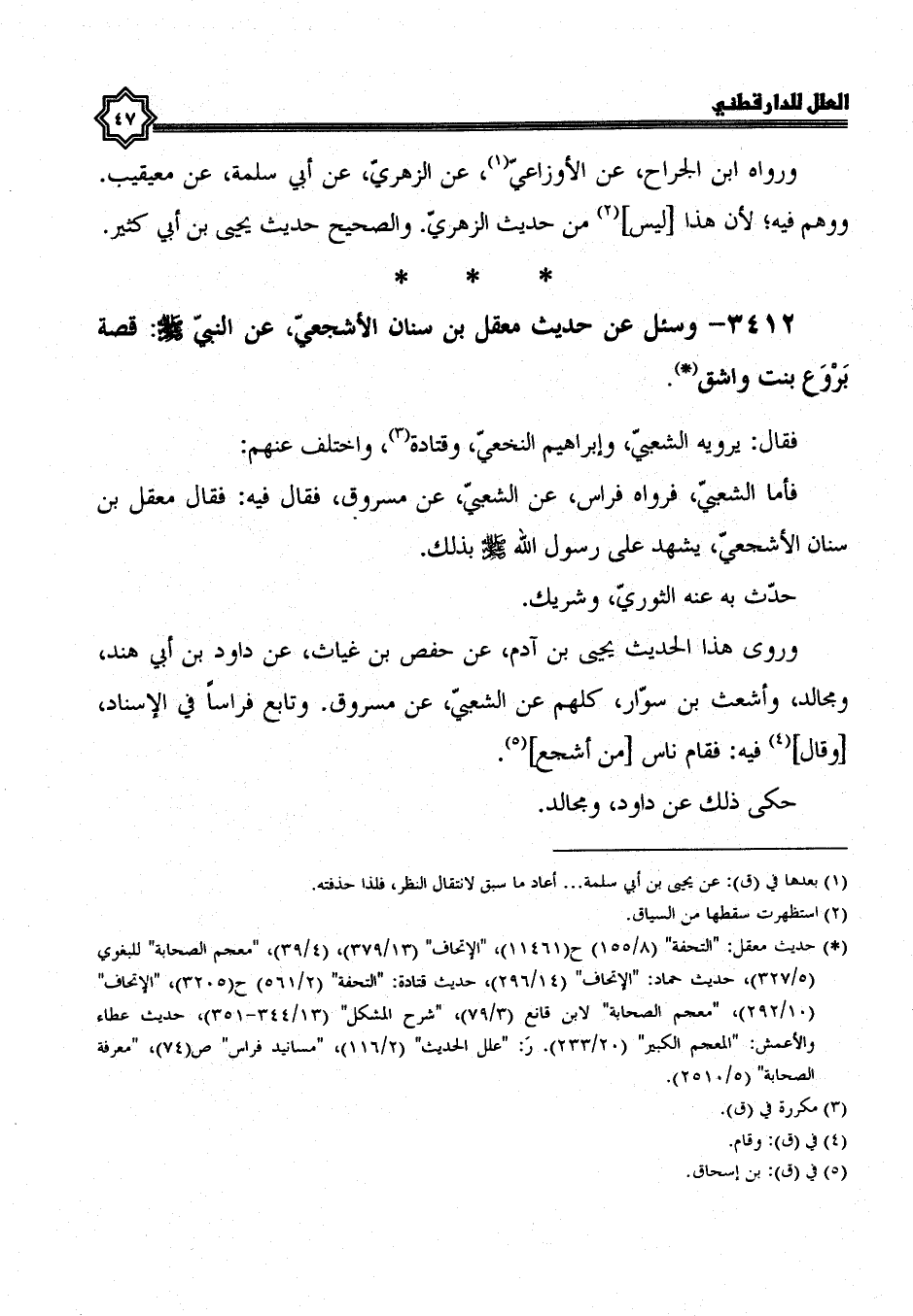 فقال: يرويه الشعبي، وإبراهيم النخعي، وقتادة، واختلف عنهم، فأما الشعبي فرواه فراس، عن الشعبي، عن مسروق، فقال فيه، فقال معقل بن سنان الأشجعي يشهد عَلَى رَسُولِ اللَّهِ صَلَّى اللَّهُ عَلَيْهِ وَسَلَّمَ بذلك، حدث به عنه الثوري، وشريك، وروى هذا الحديث يحيى بن آدم، عن حَفْصُ بْنُ غِيَاثٍ، عَنْ دَاوُدَ بْنِ أَبِي هند، ومجالد، وأشعث بن سوار، كلهم عن الشعبي، عن مسروق، وتابع فراسا في الإسناد، وقال فيه: فقام ناس من أشجع حكى ذلك عن داود، ومجالد