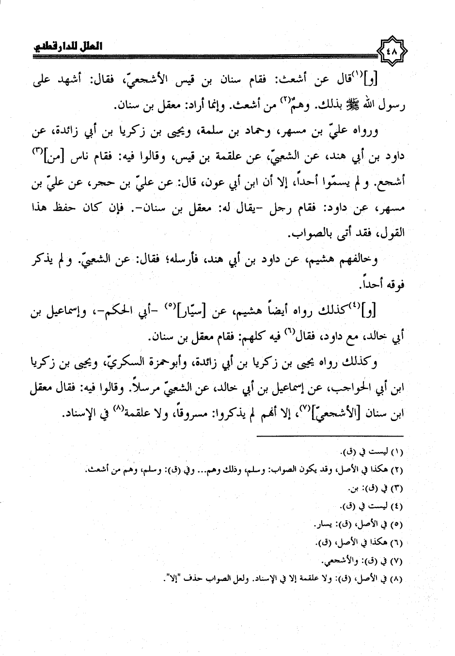 ورواه علي بن مسهر، وحماد بن سلمة، وَيَحْيَى بْنُ زَكَرِيَّا بْنِ أَبِي زَائِدَةَ، عَنْ دَاوُدَ بْنِ أَبِي هِنْدٍ، عَنِ الشَّعْبِيِّ، عن علقمة بن قيس، وقالوا فيه: فقام ناس من أشجع ولم يسموا أحدا إلا أن ابن أبي عون قال: عن علي بن حجر، عن علي بن مسهر، عن داود: فقام رجل يقال له: معقل بن سنان: فإن كان حفظ هذا القول فقد أتى.