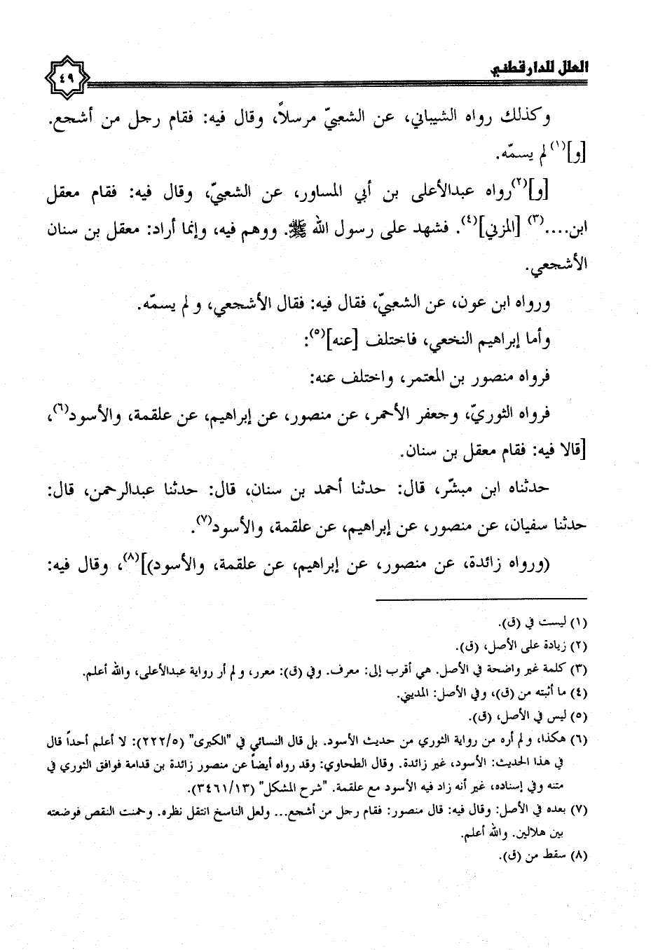 وأما إبراهيم النخعي فاختلف عنه فرواه مَنْصُورُ بْنُ الْمُعْتَمِرِ، وَاخْتُلِفَ عَنْهُ فَرَوَاهُ الثَّوْرِيُّ، وجعفر الأحمر، عن منصور، عن إبراهيم، عن علقمة، والأسود قالا فيه: فقام معقل بن سنان حدثناه ابن مبشر، قال: حدثنا أحمد بن سنان، قال: حدثنا عبد الرحمن، قال: حدثنا سفيان، عن منصور عن إبراهيم، عن علقمة، والأسود.