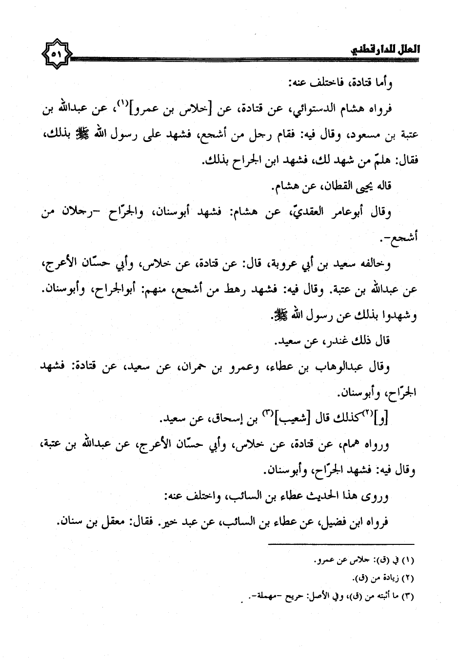 وأما قتادة فاختلف عنه فرواه هشام الدستوائي، عَنْ قَتَادَةَ، عَنْ خِلَاسِ بْنِ عَمْرٍو، عَنْ عبد الله بن عتبة بن مسعود، وقال فيه: فقام رجل من أشجع فشهد عَلَى رَسُولِ اللَّهِ صَلَّى اللَّهُ عَلَيْهِ وَسَلَّمَ بذلك، فقال: هلم من شهد لك، فشهد ابن الجراح بذلك قاله يحيى القطان، عن هشام، وقال أبو