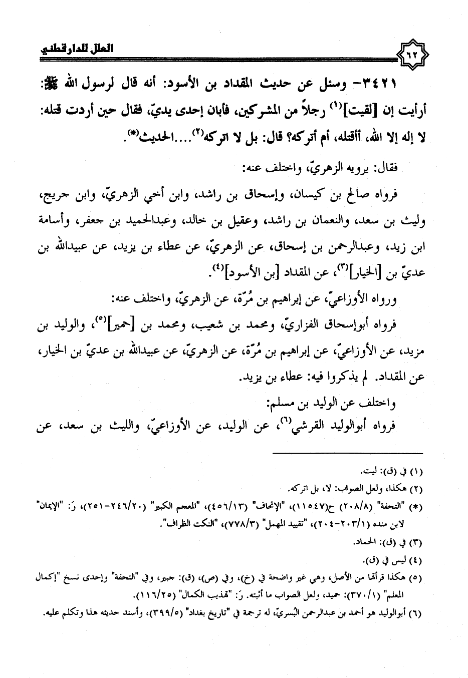 3421- وسئل عن حديث المقداد بن الأسود أنه قَالَ لِرَسُولِ اللَّهِ صَلَّى اللَّهُ عَلَيْهِ وَسَلَّمَ: أرأيت إن لقيت رجلا من المشركين فأبان إحدى يدي فقال حين أردت قتله: لا إله إلا الله أأقتله أم أتركه؟ قال: بل لا، اتركه الْحَدِيثَ.