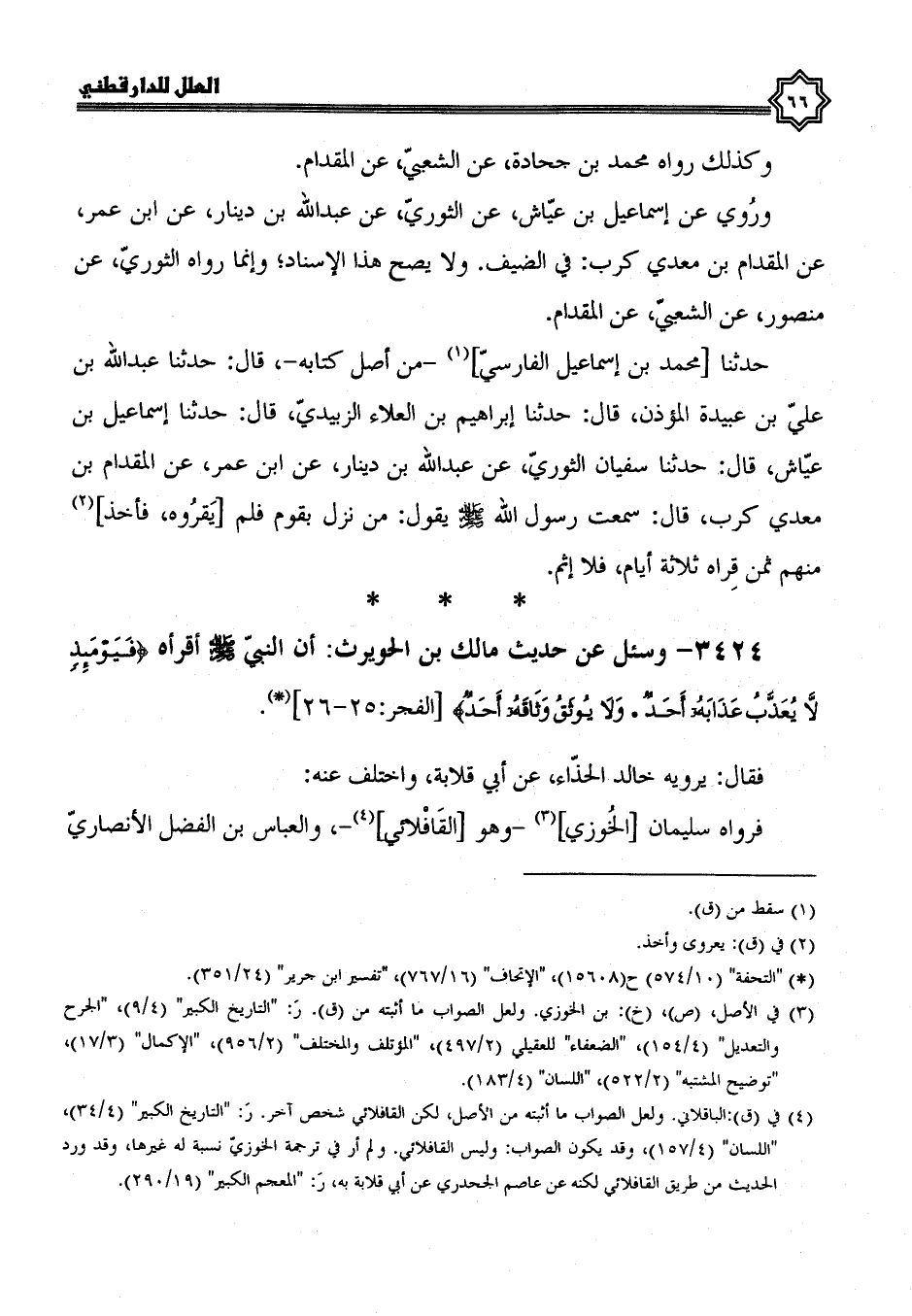 - قاضي الموصل، ومسدد بن عطاء، عن خالد، عن أبي قلابة، عن مالك بن الحويرث وخالفهم شعبة ووهيب، وَحَمَّادُ بْنُ زَيْدٍ، وَعَبْدُ اللَّهِ بْنُ الْمُبَارَكِ، وعباد بن عباد ومحبوب بن الحسن، والخفاف رووه عن خالد، عن أبي قلابة، عمن أقرأه النبي صلى الله عليه وسلم ولم يسموه وهو المحفوظ عن خالد.