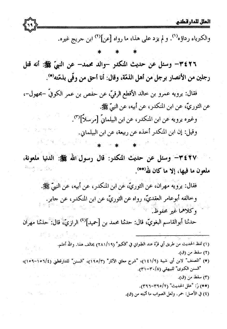 3426- وسئل عن حديث المنكدر والد مُحَمَّدٍ، عَنِ النَّبِيِّ صَلَّى اللَّهُ عَلَيْهِ وَسَلَّمَ إنه قتل رجلين من الأنصار برجل من أهل الذمة وقال: أنا أحق من وفى بذمته.